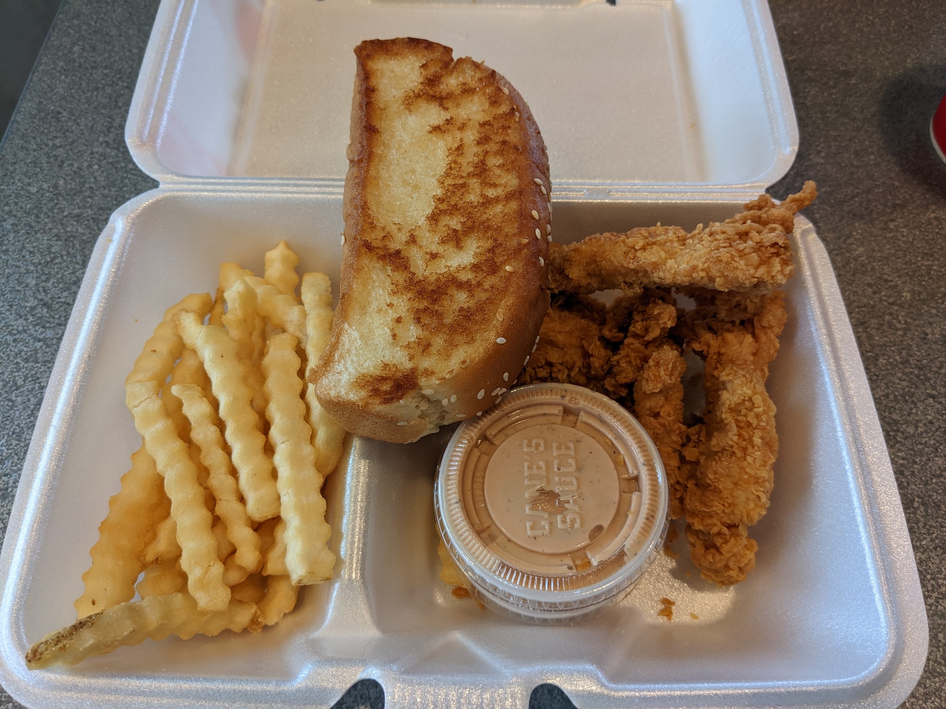 Read moreMy first time eating here. Heard a lot of hype about it from Texas friend's back in LA where I live. Their signature sauce was good, everything else was just eh. By the time I got to my hotel down the street and ate it everything was lukewarm and the chicken was soggy. Wasn't much seasoning at all on the chicken and the fries had zero salt on them. Also of note the chicken tenders are TINY. They look huge on the menu pictures, don't be fooled. I got the 4 piece and was still hungry after.