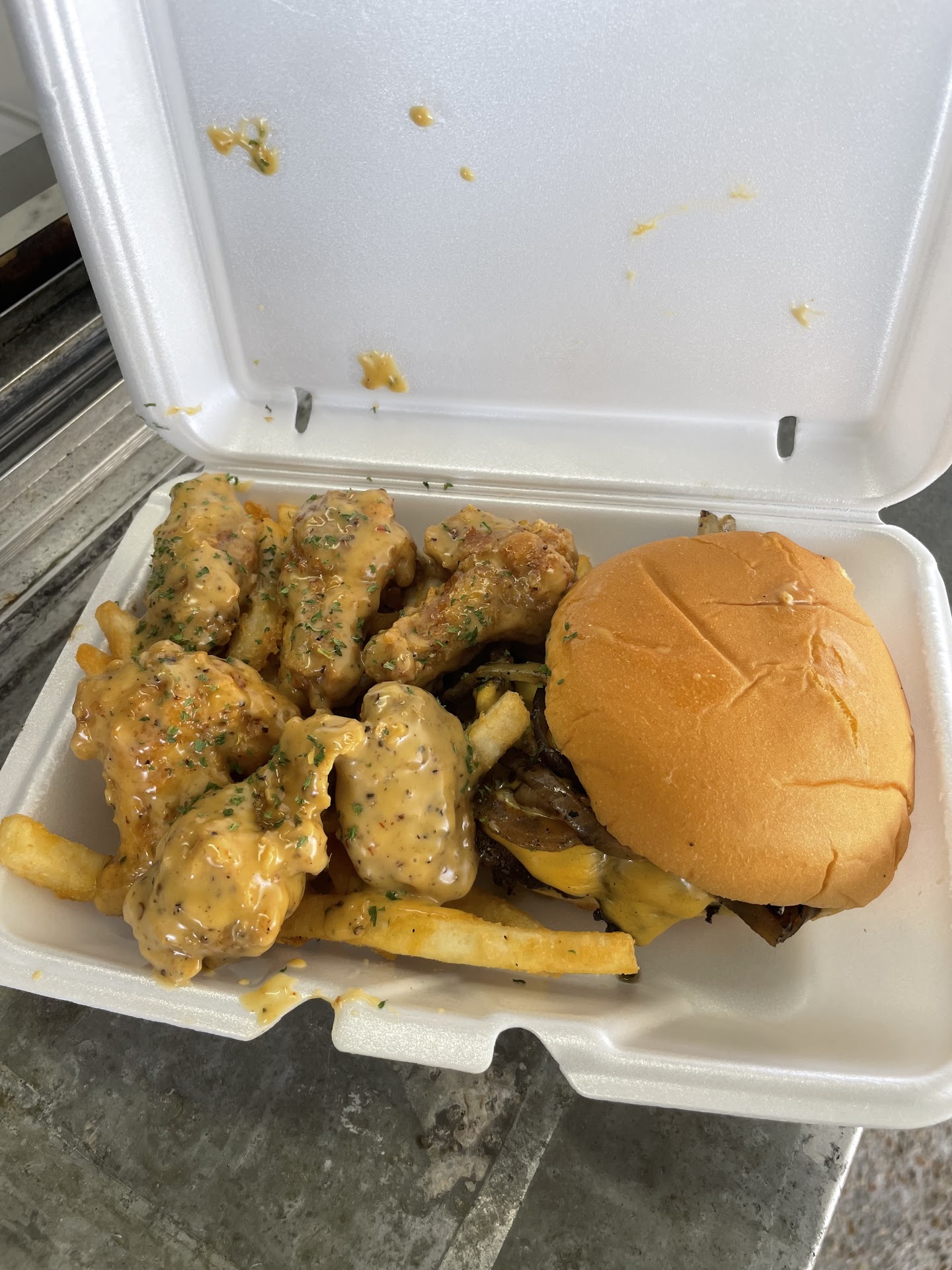 Read moreI pass this place all the time and sexed randomly to stop today. Well let’s just say they gained a customer for life! The guys were sooooo nice and helpful. I wanted a burger and wing combo but they didn’t have it. Needless to say from my photo they do now!!! And it was DELICIOUS 🤤 Omg that burger sauce is amazingly flavorful! I added grilled onions for an xtra buck and there was a mountain of them lol. Thank you guys so much...