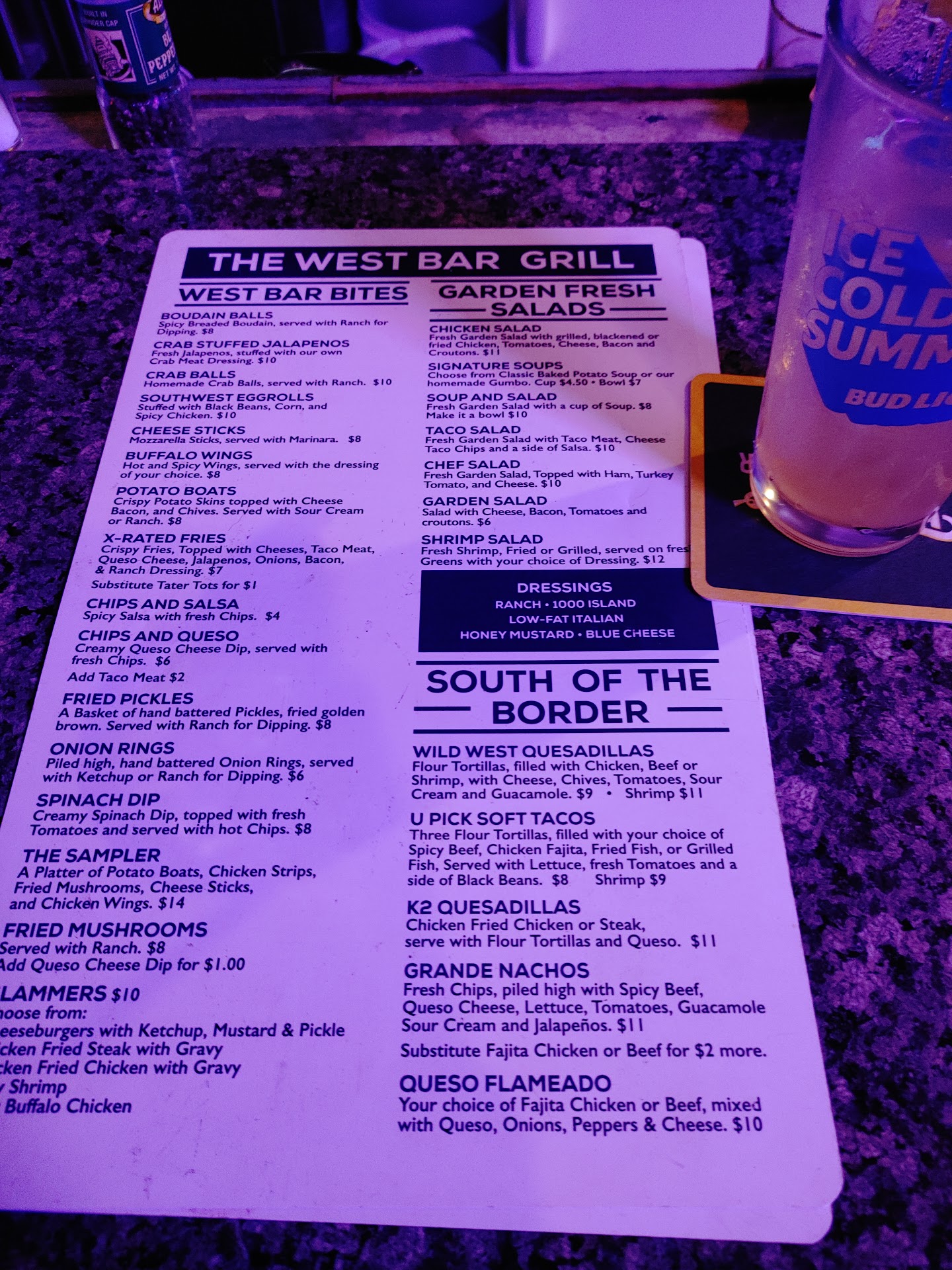 Ordered from The West Bar And Grill through Waitr! My first mistake was assuming that those high prices and fancy descriptions & pics of their food items actually represented what I was paying to receive! We ordered through Waitr, which is always the way to go, especially if your trying a place for the first time! Which we were. The West Bar And Grill needs to either get a new chef or come down off their high horse, price and describe their food as it is...a little worse than fast food!!! This is what we got compared to what the menu described: From the Appetizers menu- Onion Rings $6.60 Piled high hand-battered onions rings served with ranch: What we got: There were only 8 onion rings in what was supposed to be a "piled high" appetizer order, and they were extremely thin and greasy...NO RANCH...a whole bunch of ketchup though! So that's$.82/.83 cents per onion ring!!!
