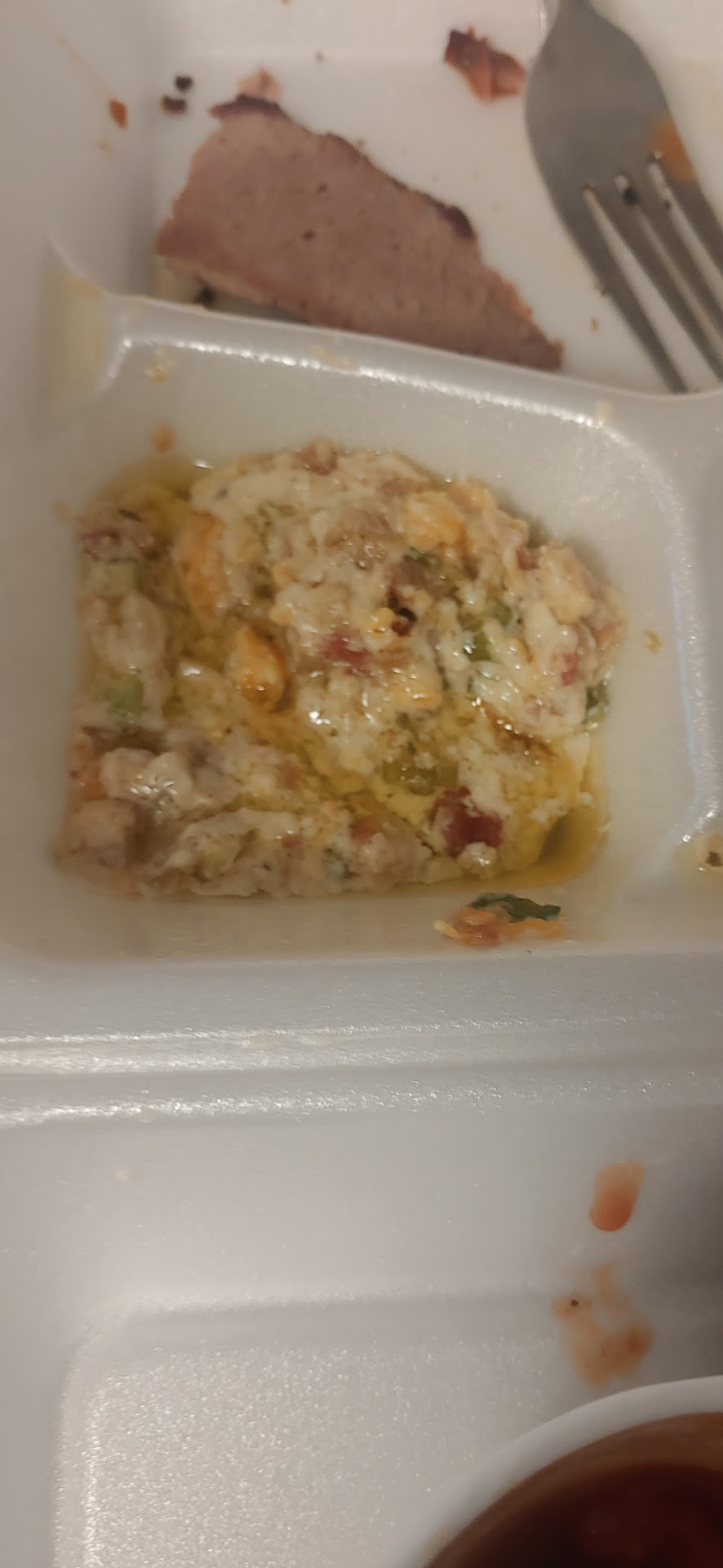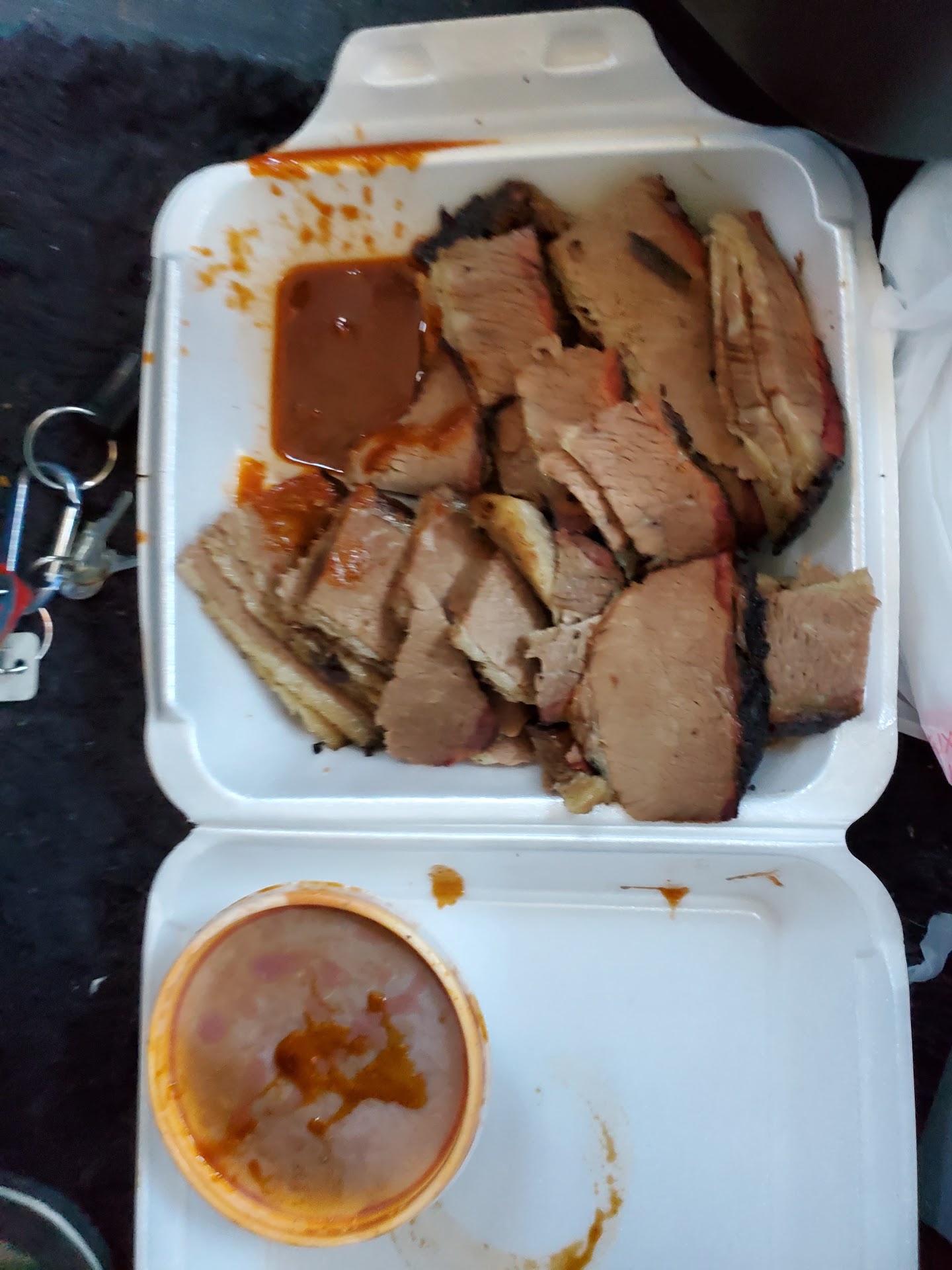 Read moreThe brisket was on the dry side not much smoke flavor was good enough to eat. I think they cold smoke it center was pink like pastrami. The ribs were better than the Brisket good amount of seasoning and the smoke flavor was more pronounced I enjoyed them a lot more. The sausage was pretty good and wasn't overcooked. BBQ sauce made the food taste better, it had a good smoked flavor that seemed like from meat juices. Pinto beans were very good and the corn was very different never had any like it before. Tried my wife's mustard potato salad it was on point. If I'm ever back in town I'll just get the ribs. The brisket needs some work but everything else was good. My daughter had the baked potato with Brisket she said the meat was dry as well and needed more sauce to make it good. Service was great, man had a good sense of humor and was funny and joked alot, lady a register was polite...