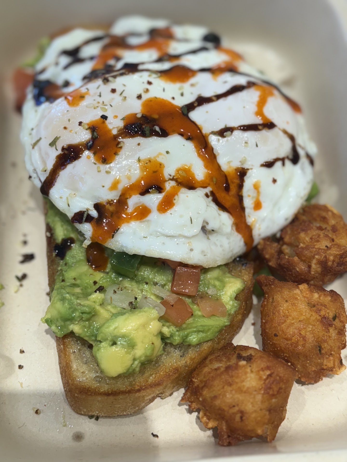 Read more4 stars. First time in. We have a large truck, so for us... parking was "tight." No biggie, though. We entered in and were greeted after looking at the nenu for about one minute. We were told how the restaurant worked, so we took our menues to a table looked over them then ordered at the front desk. Our food came out quickly. We got a frozen rose memosa that I loved. The price for the size was a tad off for me. I would have been more comfortable with about...2 dollars less or a larger cup. My freckled lemonade was just okay. Maybe because I was expecting it to be tangy like lemonade normal is. My avocado toast was really good. Salt and pepper on the table. I added pepper because I love pepper and could have added salt.. but choose not to. It's not a big deal for me, though. My husband's food to me was excellent. He thought it was a good portion and flavorful. Despite the other review saying the chicken lacked flavor. Maybe it was just their chicken because ours was good. We did find, unfortunately, some plastic wrap in our food. We informed Ashley so that she could correct or inspect the kitchen. We never expect food comp when we inform management, but that is what we got. We are appreciative, that's not why we do it. We really enjoyed the place, and occurrences like that could stop patronage. All staff was happy and friendly. It's small inside, which I kinda liked. Because the kitchen won't get overloaded. Outdoor seating with umbrellas and a drive-through. So...4 stars forth price being slightly higher than I would have liked and the plastic. We will definitely be back. Just a nit pick. I dont care for plastic flowers on the table. (Just...