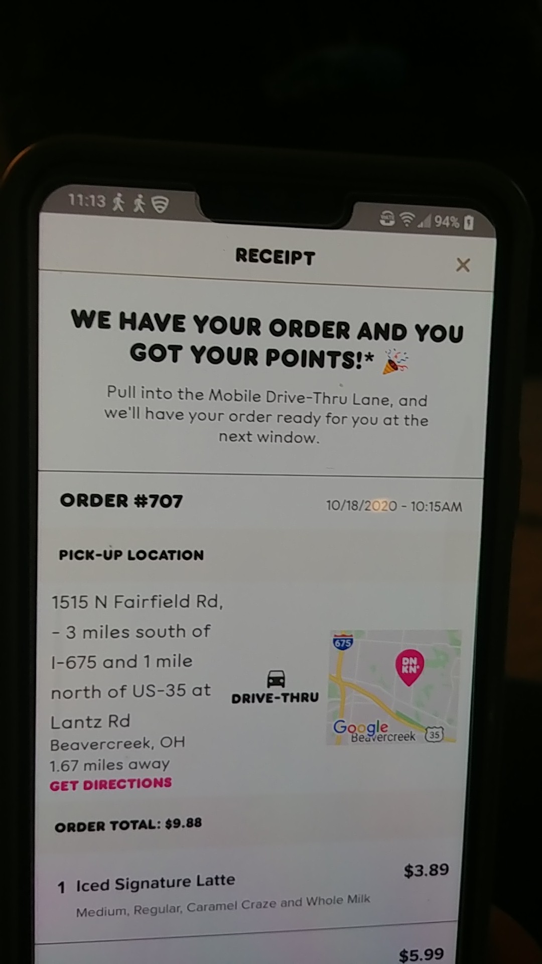 Read moreUsed the mobile app to save time on 1/2 dozen donuts and an iced coffee...ended up being a waste of time. When we ordered on the app it said the order would be ready immediately. When I arrive at the window 10 minutes later my order is, in fact, not ready. The iced coffee was made hot (so totally incorrect there) and the drive-thru employee asked me to pull to the 2nd window while they make the correct coffee (why did I use the app, seems like a waste of time). At the 2nd window another employee hands me my iced coffee after neat 5 minutes waiting. Meanwhile, no less than 4 cars behind me get their orders and leave (again, why did I fall victim to thinking the mobile app was a time-saver?). The young lady hands me the iced coffee and says, "Sorry about that, have a good day," I asked her if I could please have my donuts. She looks at me, looks at the receipt then begins making my donut order. So...that Dunkin' app said my order would be ready when I got to the store, not that it would be made when I go to the store. Facts: it wasn't ready and wasn't correct. To add insult to injury one donut I purchased on the app was not available (why didn't this useless app tell me they were out of sour cream donuts? Maybe I answered my own question.) Useless app.