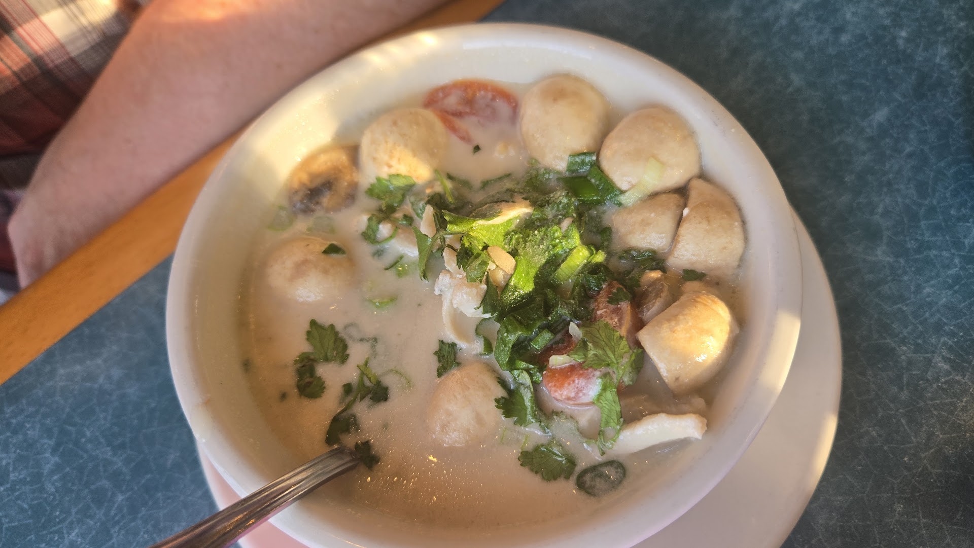Read moreI love that statement, "Don't judge a book by its cover", cause on the outside, it's like a pepto-bismol pink building that looked like a diner that had been painted over to stand out in the middle of a random corner, which they accomplished. You can't miss it. But the moment you step in, you're teleported to another place in the world. The ambiance is beautiful and gives a very cozy feel. When it comes to the service, the staff is very friendly. I will say that we must have come during a busy time (there were about 8 booths filled) or they were short staffed, but our waiter wasn't as attentive as I've experienced. I'm sure the person was very busy with other things on their mind. We ordered the Masaman Curry and the Tom Kha Soup as well as Boba. The Boba is owned by another company so you'll end up paying that separately. It was delicious and they offered non-dairy options which was a HUGE plus. The Masaman curry already came with potatoes and carrots. And they give you an option to choose your "meat". I chose extra veggies and asked for potatoes specifically. I guess my request was lost. đ cause it was 80% broth and like 3 potatoes. Don't get me wrong, the food was delicious, especially with rice. The potatoes were super undercooked. So I took the rest home. Added more potatoes and tried to boil the potatoes they had and it still didn't soften up much. It was a bit strange. I'd rate the dish 8/10, cause the flavor was great. Total experience about 7/10. Unfortunately, my spouse mentioned that the chicken was really hard, but the broth was good.