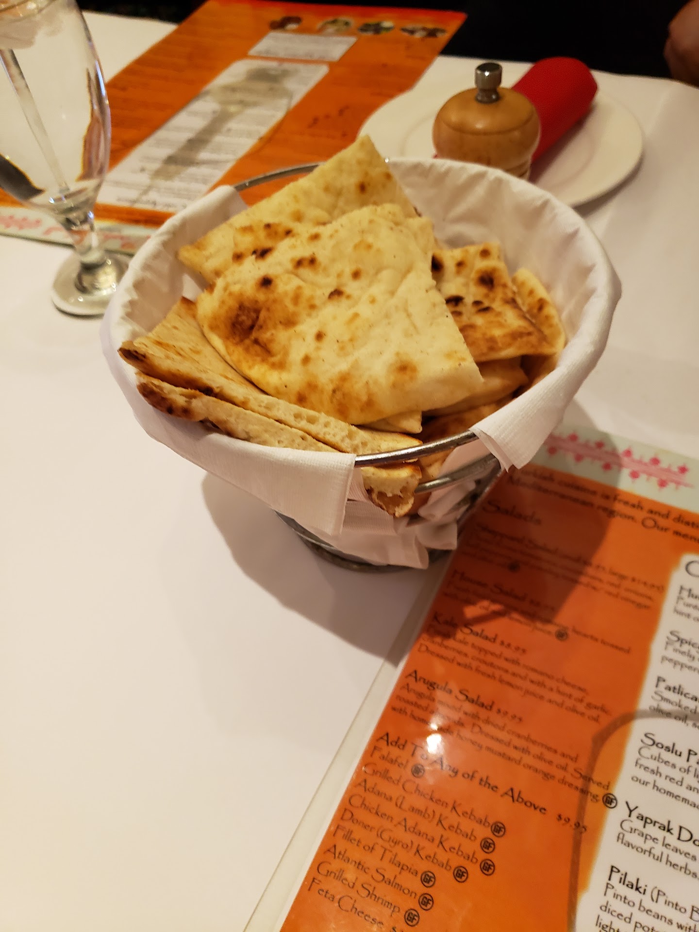 We love mediterranean food, try to avoid chains, and so decided to try Pasha while visiting Dayton. It's a Turkish restaurant located in a faux village in Beavercreek, packed with pedestrians and upscale shops. At 6:30 on Saturday the place was pretty crowded and kind of loud, but it was too hot to sit outside. They found us an open table for 2 in a side area. It was one of those with bench seating along the wall with several tables very close together (so close you have to sit right next to another person before you scoot into your spot). It was like having dinner with strangers--certainly not intimate or romantic. And unfortunately, one of the couples in the middle table was loud and obnoxious (boasting about having illegally molested a manta ray during his Hawaiian vacation for a bet). The server recommended a glass of good Turkish red wine (Kavaklidere Yakut) to complement our meal choices, which she brought out with a complementary basket of warm pita and a lightly spiced (not much taste, really) oil. We ordered some excellent babaganush instead--probably the best I've ever had. One entree was a generous portion of moussaka that was prepared in a layered Greek style, which is what most Americans are used to. It was good, but had too much something that left an aftertaste--cardamom maybe? It also had a small piece of bone in the meat that I had to spit into my napkin. Our other entree was karniyarik (stuffed eggplant). It was tasty, but my husband told me later he also had to spit out some small, inedible pieces of gristle. And at some point hubby ran out of water, but the server's assistant didn't come back with refills until we were nearly finished (she was running around filing glasses, but seemed overwhelmed). The check before the tip was just over $60. Overall, dinner was okay. I'd go back if we could get a better table but would probably order something that didn't have ground meat--our 'neighbor's' chicken kabob and falafels both...