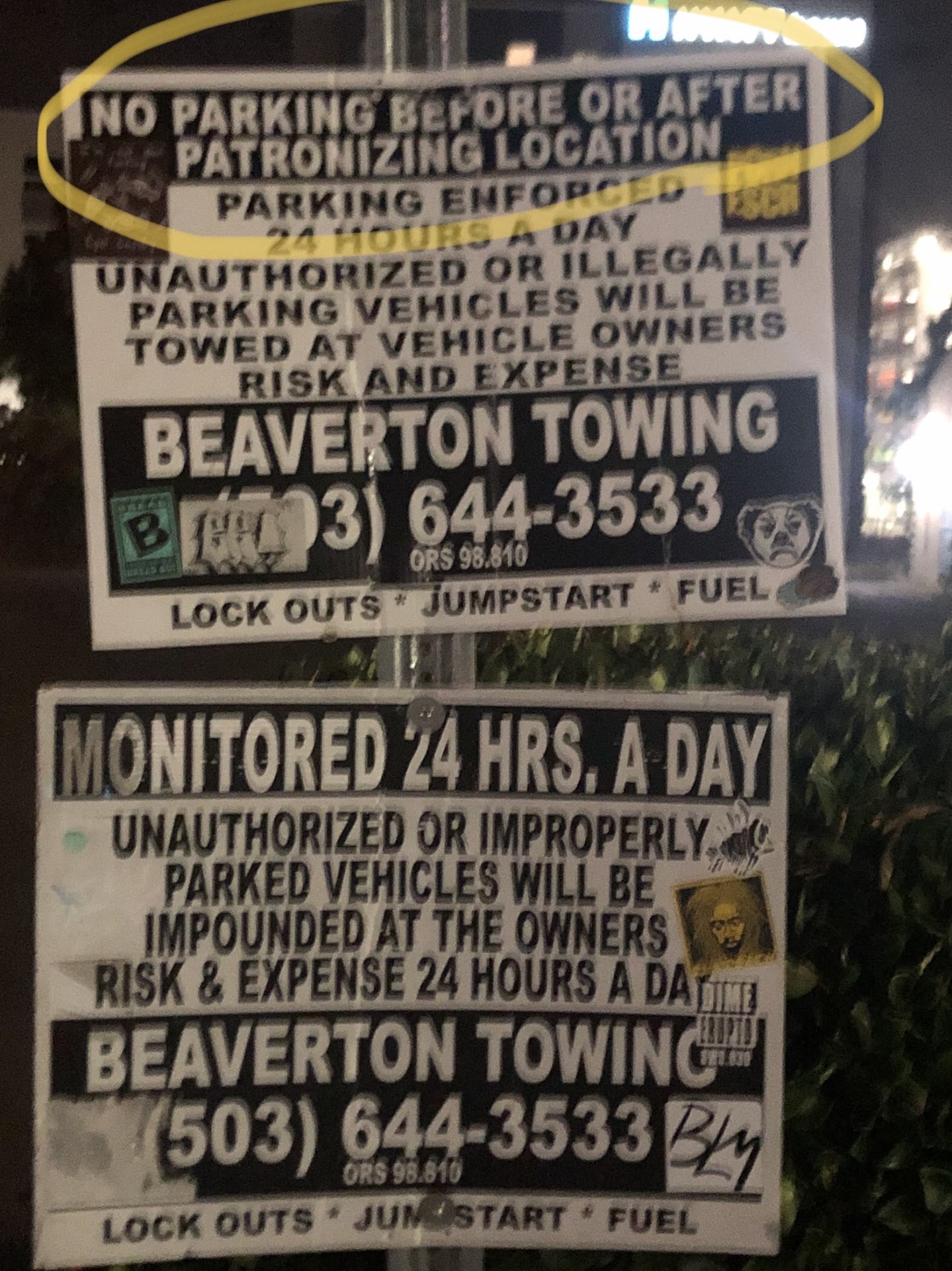 I believe both of these companies know what they are doing. It would be incredibly easy to post a sign that says, “Parking for BG’s Food Cartel customers only from 11:00 am to 10:00 pm” but instead they’ve opted for this cluttered jumbled mess of a sign made by Beaverton Towing - who have the most to gain from your confusion. The food cart pod also doesn’t have their hours posted on their gate.