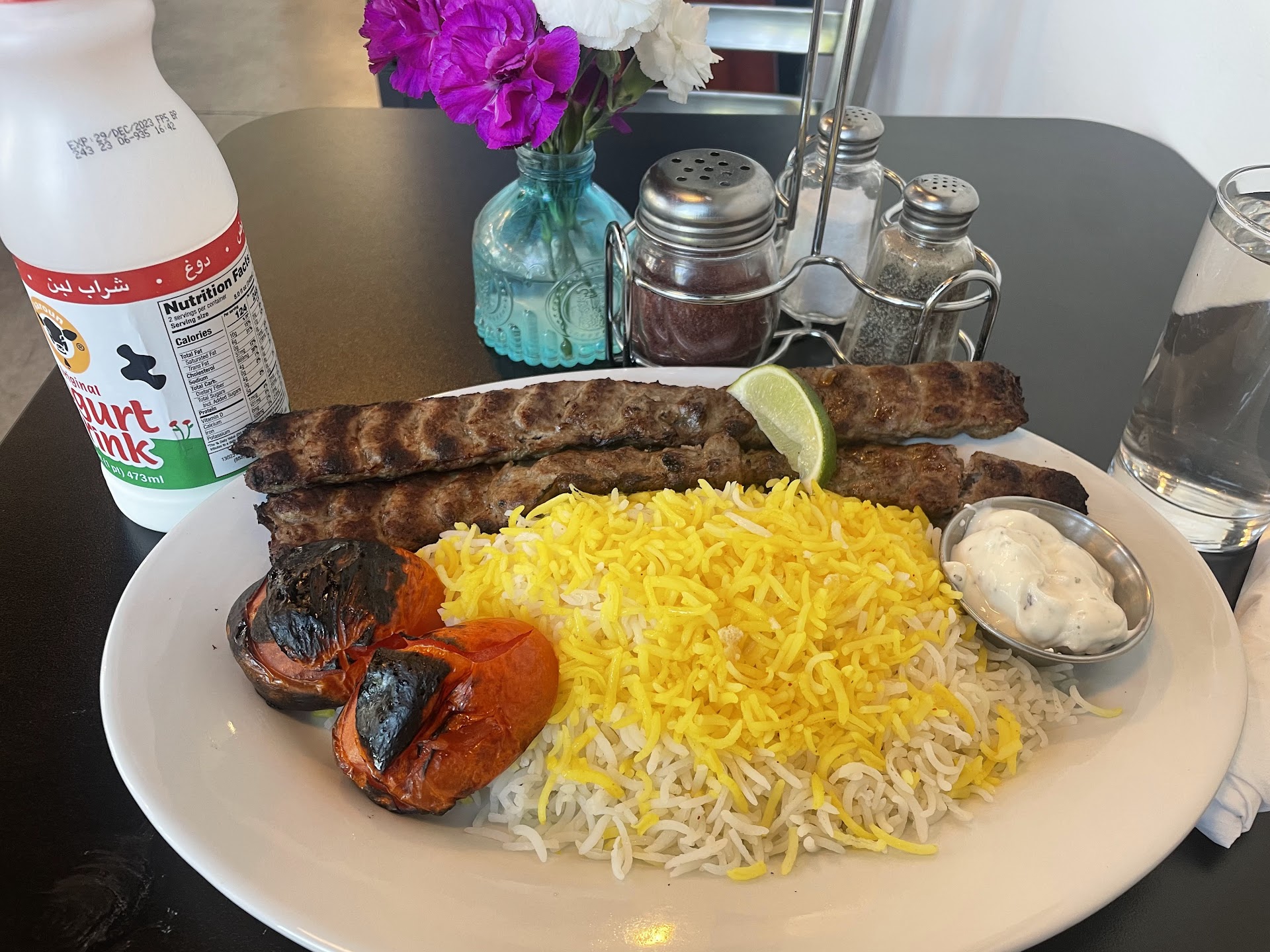 For our entree we got the Vazirie Kabob which is kubideh kabob and jujeh (chicken) Kabob with saffron rice, grilled tomatoes, and a small maste khiar (yogurt sauce). Chicken was so juicy and fluffy ; I think it was even breast meat so even more impressive. Kubideh was so juicy as well, which my husband gobbled up happily. Overall, seasoned well and we added more sumac just for luck.