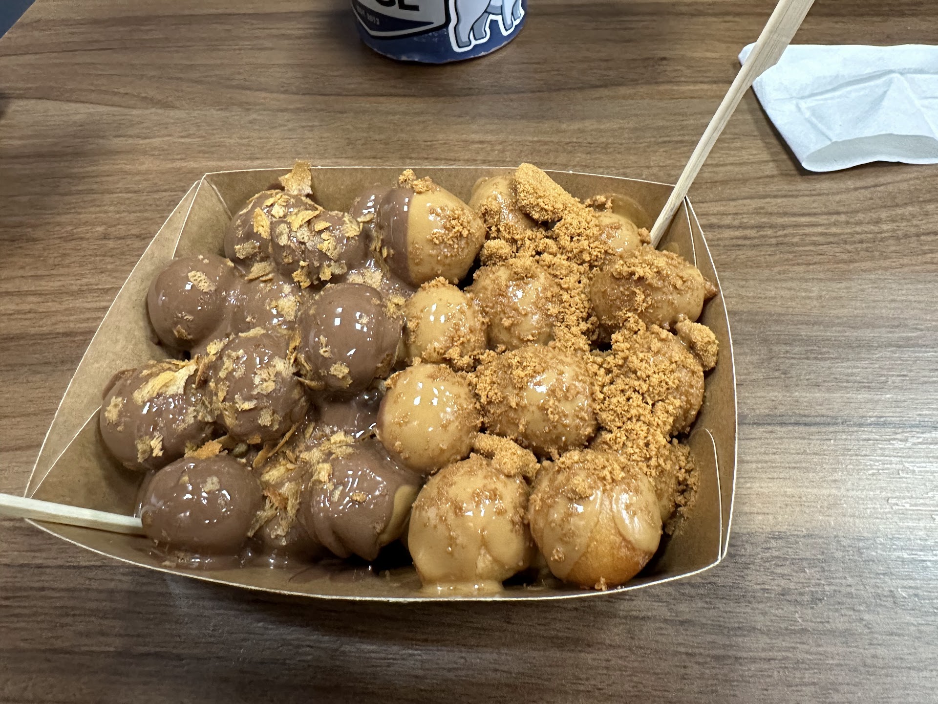 This time around I got the Lokma. Best way I can describe this is it’s a softer/fluffier donut hole, sorry don’t mean to offend by calling it a donut hole. Up until my recent visit I use to get the Lotus topping, which is crumbled biscoff cookie over a biscoff type Carmel. It’s my favorite flavor on anything I get there. I highly recommend trying it. Yesterday the gal working told me I can choose 2 toppings!! My inner fat kid started drooling, haha, so I also chose Nutella! The combination of flavor did not disappoint! Haha.