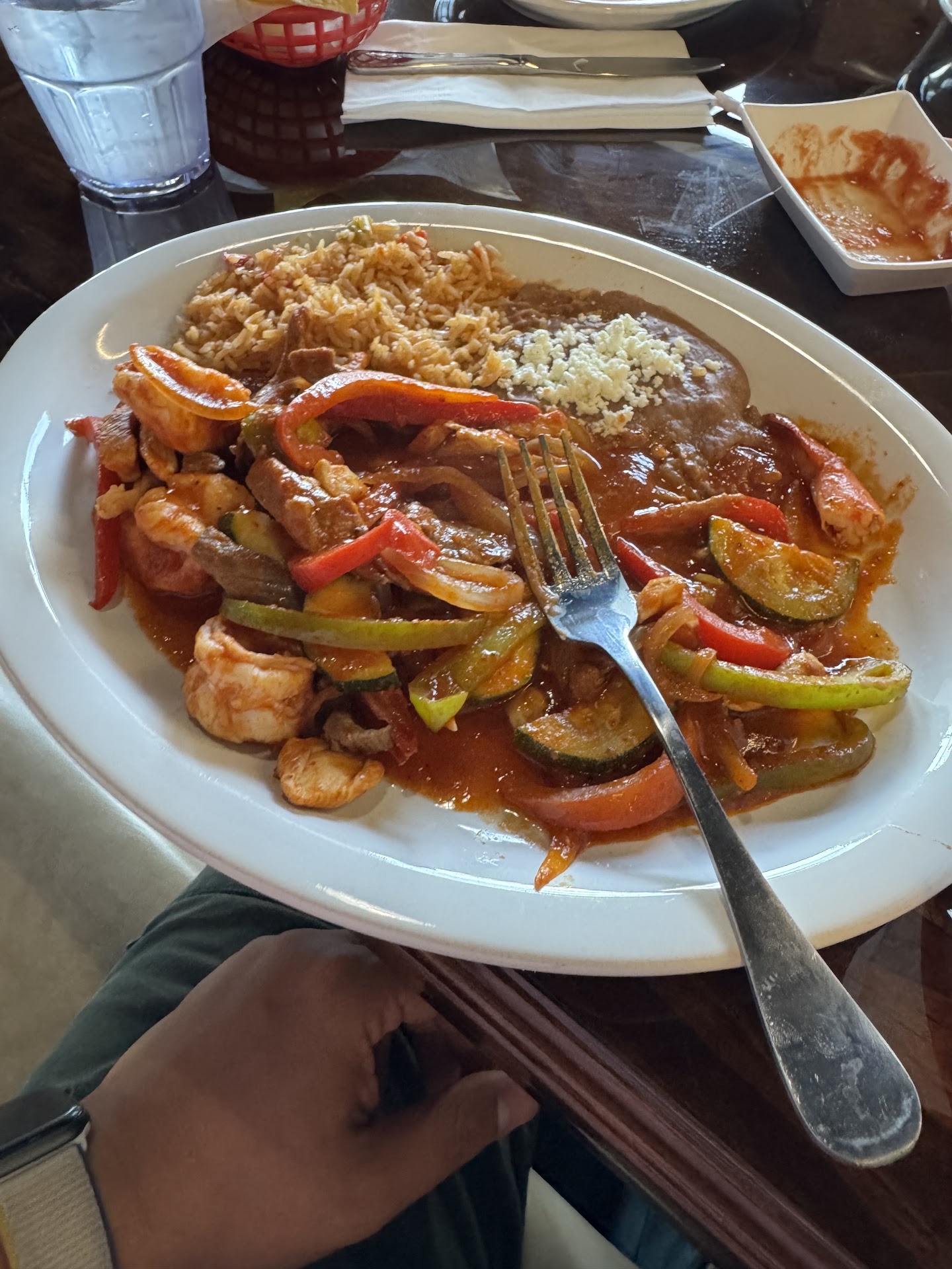 I had the ceviche and friend she had camarones de almoja de ajo sauce. Lots of garlic... she thought it was good first time for her to have that much garlic...I thought the presentation was nice. I had the ceviche. Lots of pulp, shrimp and fish. Winter in Oregon it is hard to have tomatoes.... but for color yes.