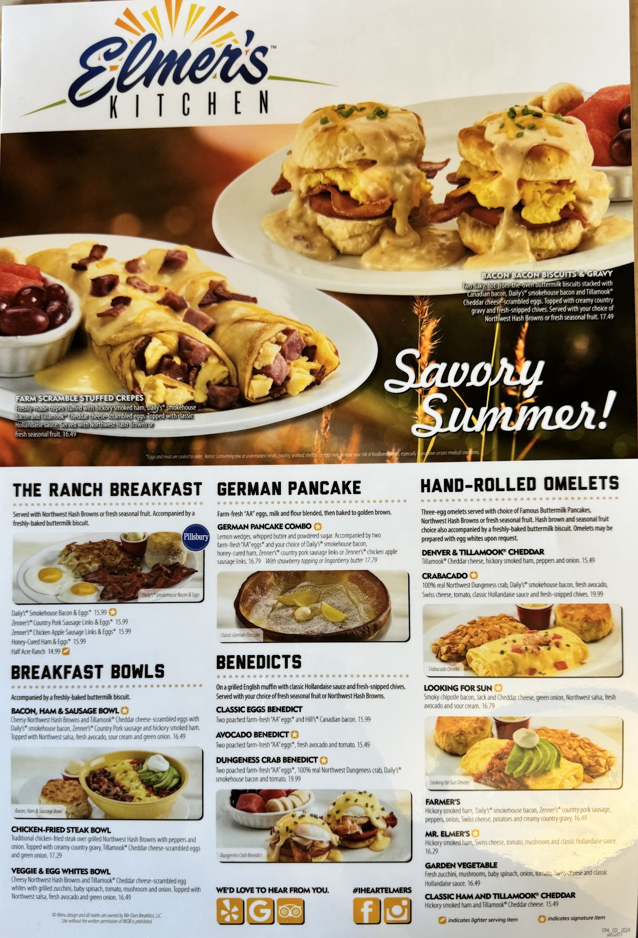 Read moreElmerâs Kitchen is our go-to brunch spot after a good hike. We always order the omelettes with a side of buttermilk pancakes, an Elmerâs Kitchen has become our favorite stop for brunch, especially after a good hike. Thereâs something about walking into a welcoming spot where you know exactly what youâre going to order and that it will always hit the spot. For us, itâs the omelettes paired with their classic buttermilk pancakes â and itâs honestly the perfect combination.
