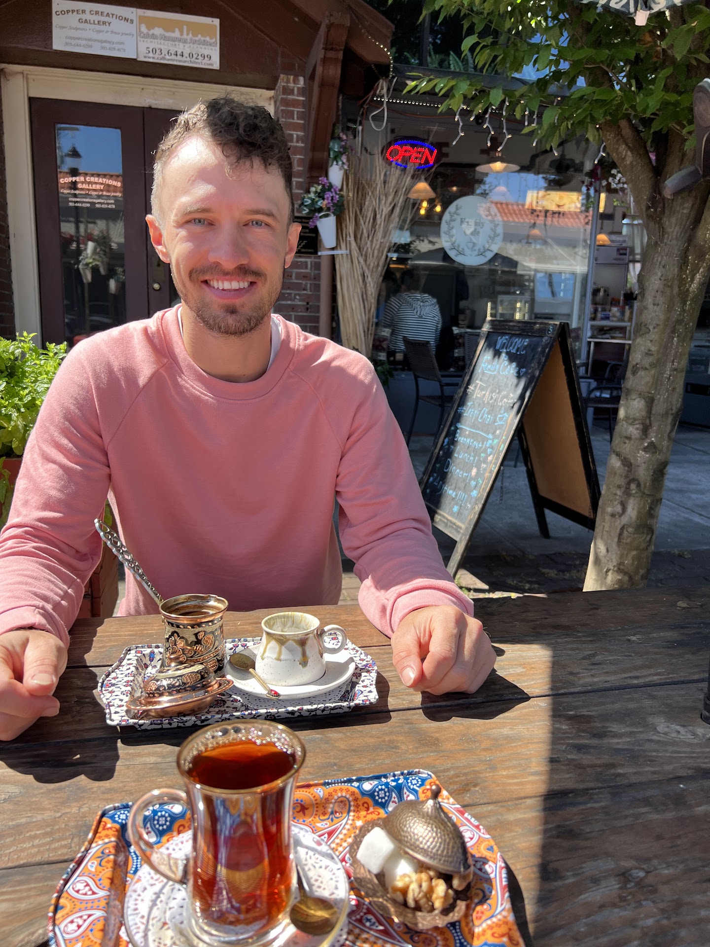 As we settled in, our attention was immediately drawn to the captivating sight of Turkish coffee dishes adorning the tables of other patrons. Intrigued, we decided to try the Turkish coffee along with some Iraqi chai. Adding just one cube of sugar, we were instantly blown away by the incredible taste. Even now, the thought of it makes my mouth water, evoking a childlike joy that had me sitting on the picnic table, gleefully swinging my legs to and fro. The coffee experience alone was nothing short of incredible.