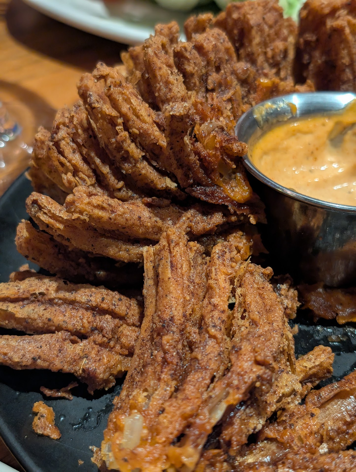 Was famished after a great hike, hence we decided to head over, since i had never tried this place before. Was not too crowded on a Monday at 5pm. But there were quite a few patrons there. Pet friendly patio with 3 tables, each capable of seating 4-6people. Masks were necessary to get welcomed inside but they were not mandatory to be worn at all times (except when eating), although it was advised. Ample space left between tables and patrons, service staff wore masks at all times. The menus provided, looked and felt sanitized. Headed inside to wash my hands before touching anything. Toilets were clean and well maintained. Automatic soap dispenser and paper towel dispenser w/ motion sensors ensured that i did not have to touch anything that i didn't need to. Ordered a lemonade w/ mango flavoring since i was parched. Then proceeded to order the 34oz bone-in ribeye with soup of the day (baked potato) and Aussie fries. Also added garlic butter and a lobster tail as extras. The server had misheard me and brought sweet potato instead of soup of the day, but swiftly rectified her mistake and got me the soup instead, at no extra charge and left the sweet potato for us to enjoy as well. Lemonade was very refreshing. Mango flavoring was at the very bottom and i liked that i had the option to mix it or not with the rest of the lemonade. I liked the Mango flavoring but my wife didnt like it as much. I thoroughly enjoyed the refreshing lemonade before and after mixing the flavoring. Also got a free refill on the lemonade. The free bread and butter(?) was light, savory and delicious as well, it was very tough to keep my hands off it. I was expecting something cheesy with the Aussie Fries, but they were just like standard fries, pretty good but nothing to write home about. Baked potato soup made up for it with the cheesiness. Was pleasantly surprised with how tasty it was. Every spoonful led to a long string of cheese from the bowl to my mouth. Potatoes were well cooked, perfect amount of cheese, soup was well seasoned. Medium rare Ribeye came out perfect. Could not cut a single piece without the meat oozing out savory goodness. Drizzled with roasted garlic butter, it was heaven. Well seasoned, flavorful, very filling, will order again. Lobster tail was pretty great as well but the garlic butter just elevated it a bit more. I usually do not get extras, but i think the garlic butter really added value to both the meat and the lobster. Finally finished everything off with the Chocolate Thunder Down Under. Light fluffy cream on top, ice cream on the bottom, chocolate syrup at the base and hot fudge on the side. Its hard to go wrong with that! Very delicious dessert, a must share among friends and family. Hot Chocolate Fudge paired with cold Vanilla Ice Cream was incredible. The light and fluffy cream on top with chocolate flakes complimented the rest of the dessert very well. Was thoroughly satisfied with my first visit. Food was delicious, service was impeccable, value for money was decent. Cannot wait to be back here again to try out the Blooming Onion and the...