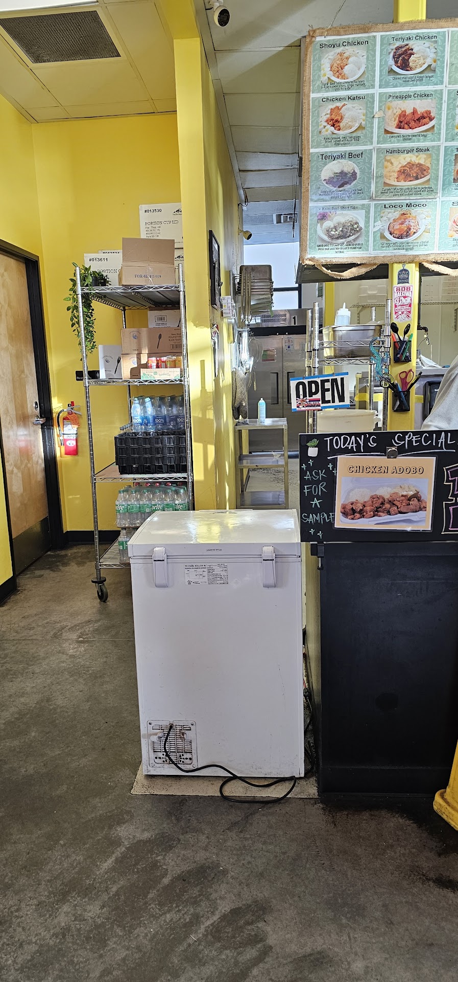 When we opened our order, 2/3 items were roughly correct, but no vegetables anywhere to be found (unless that slice of wilted lettuce on the katsu burger counts as mixed vegetables? But my entry... had some other plain chicken which was definitely not char sui. I immediately closed the flap and took it back up... politely said, "hey, I believe I asked for char siu chicken... could we do something about this?" The girl was so unimpressed she did not say a single word, nor touch my tray. She grabbed a tiny Chinese to-go box and schlepped some alternate chicken in there and handed it to me open. "Hmmm, thank you." I thought, suspicious. When I looked more closely at the table: no red, just black and brown char marks. Hey! This is chicken teriyaki... not char siu chicken!