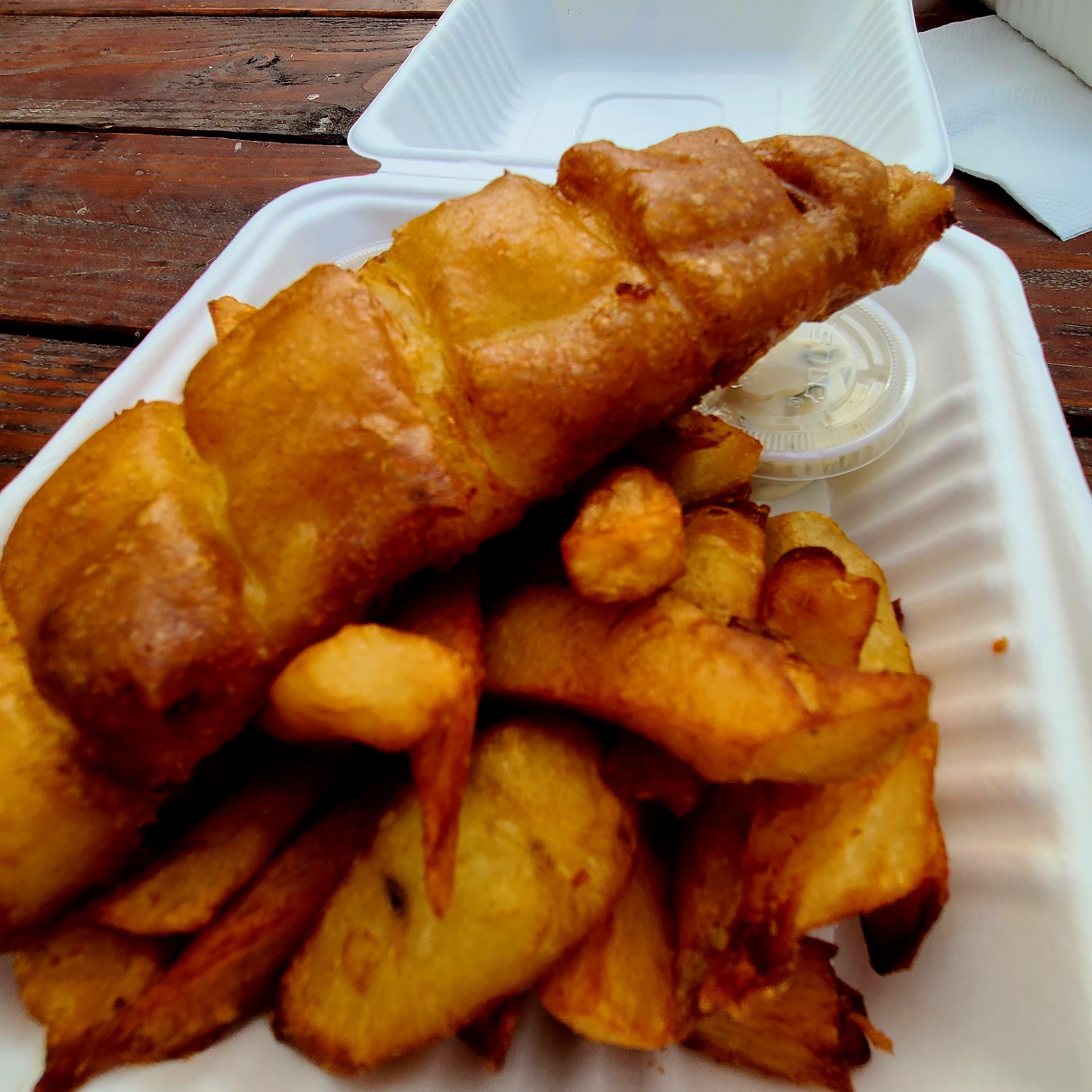 Read moreDisclaimer: I’ve never been to the UK so I can’t compare UK/English/Scottish pub haddock and chips to anything but American, Mexican and Chinese varieties of the dish I’ve had during my travels. My review is face value only. My visit was on Friday September 27th at around 11:30 am right before lunch rush. There were two orders ahead of mine. I had the large portion of the crispy haddock and chips at $14 per plate. The fish was fully cooked and tasted like haddock but the batter was mushy on one side and crispy on the other. The chips we large irregular shaped chunks of deep fried potato. Most were cooked properly but the huge variety of potato sizes meant they didn’t cook evenly. At $14 per plate I expect better prepared food. The tarter sauce was very good but the slaw was a shamefully small portion. 1/2 of a small portion cup = 1 small spoonful of cold slaw. The flavor was okay but a couple more bites would have helped judge that item. I’ve been looking forward to eating fish and chips made by a true cook of that region and I can’t say I’m impressed especially for the price. That was an $8 plate of food value for almost double the price. The only way I will try more of this guys menu is if the price is massively reduced or someone else buys the plate. BG Catel has many more food choices. Look elsewhere at lunch unless money is not your concern. I’m just being honest so no offense meant towards the...