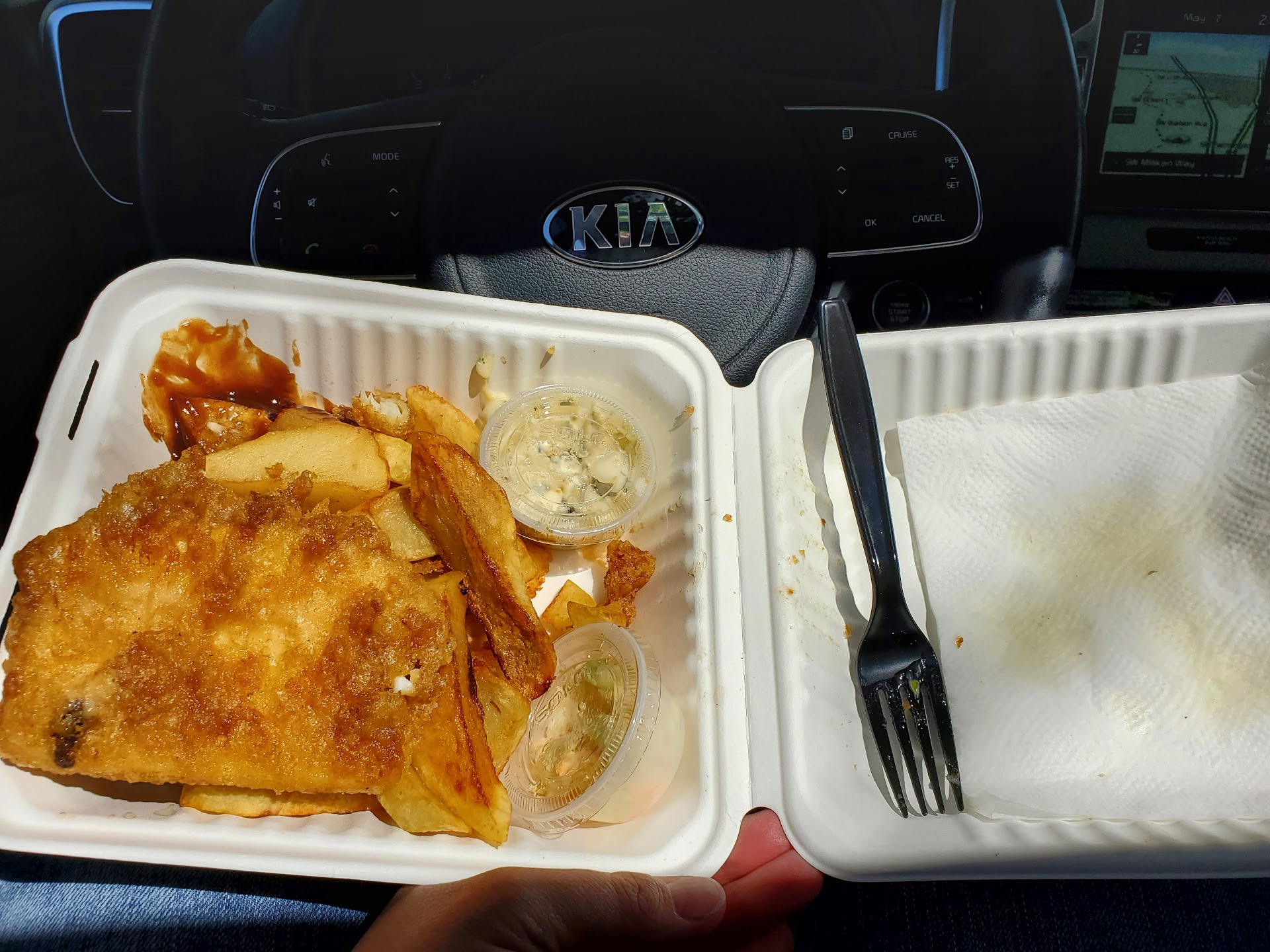 I first took a bite of the fish without any of the malt vinegar or tartar sauce. The flavor was good, although my first impression was that the breading was still sort of oily. Because the fish was fresh from the fryer, I burned my tongue and the roof of my mouth on the first bite. Definitely my fault.