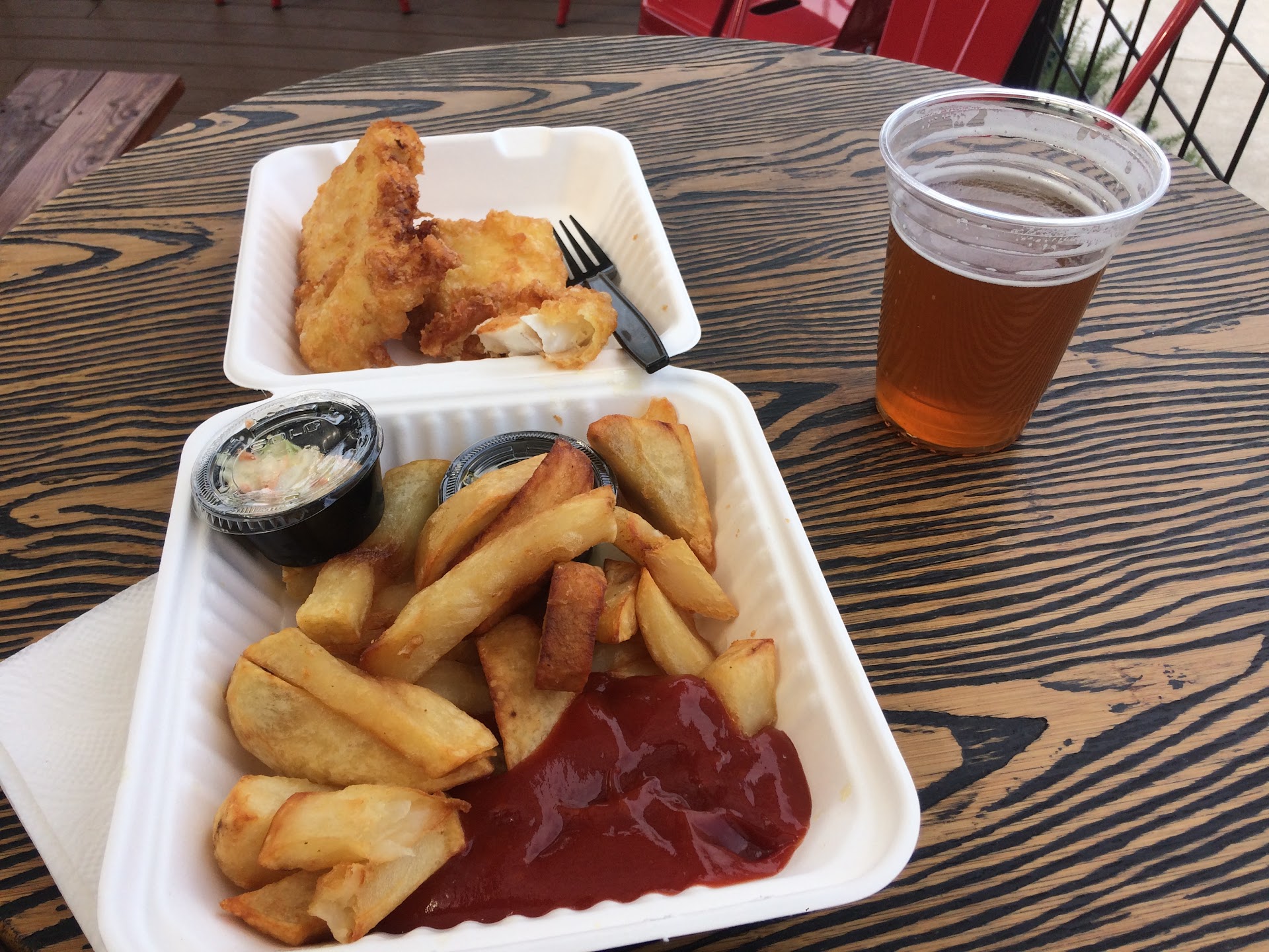 When I got my food, about ten minutes after ordering, there were several very large pieces of fish, a large quantity of fried potatoes, one unfortunately too small portion of tartar sauce, and one equally small couple bites of coleslaw. After the traditional sprinkling of salt and dousing of malt vinegar, I settled down to eat.