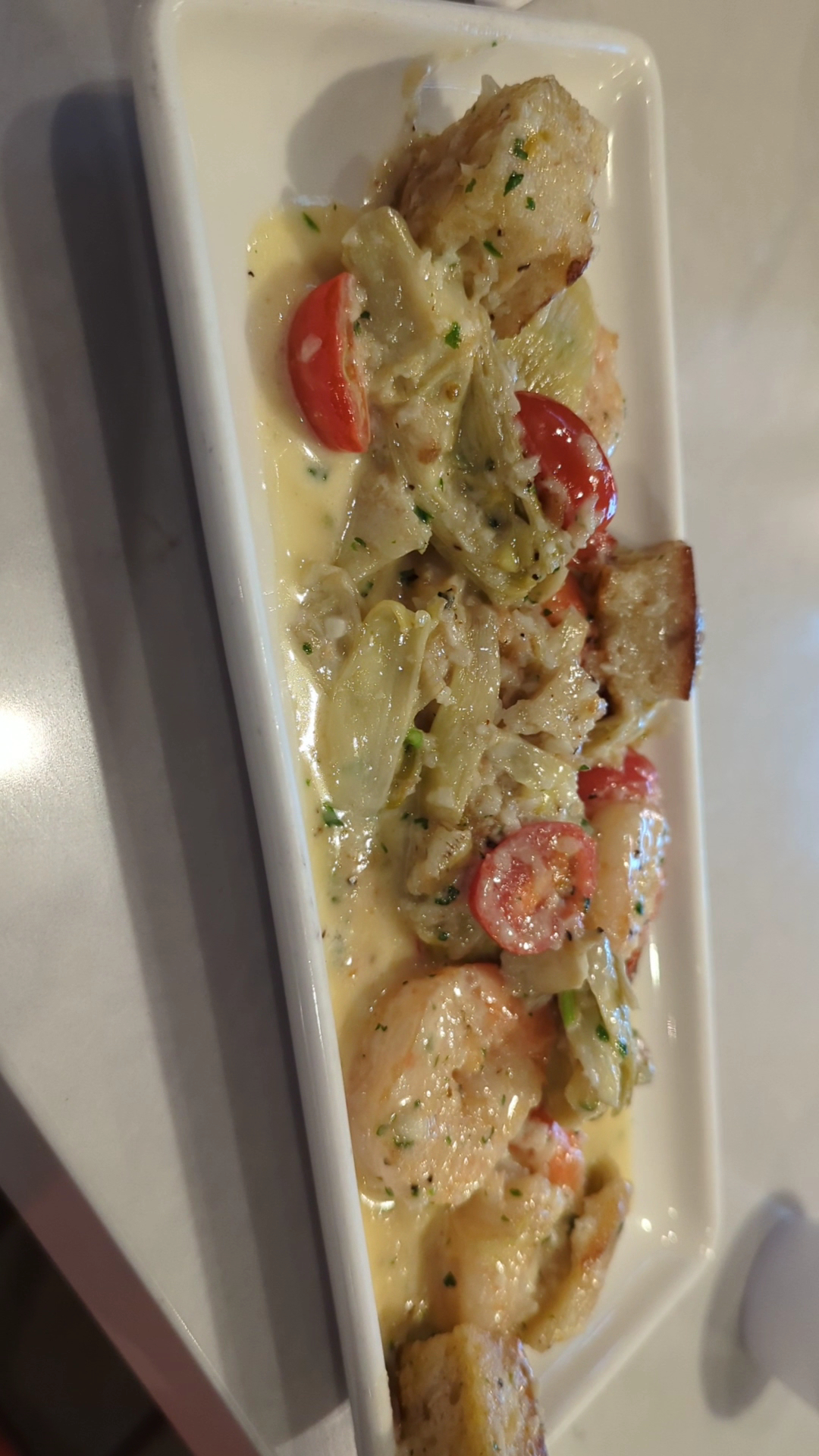 Having been our first visit, Crystal was incredibly knowledgeable about Wildfinâs menu. Sustainable, wild caught, gorgeous seafood options abound! We ordered the happy hour Tower and for $17.95, we received a beautiful trio of apps. On top was a perfectly cooked, lightly battered calamari steak in which they marinate buttermilk overnight. I had zero complaints. The second plate was a generous helping of large prawns smothered in a yummy caper sauce with artichoke hearts and bread cubes seasoned and toasted to perfection, as they soaked up the sauce perfectly. The bottom plate was wildfinâs in-house smoked salmon dip served with crostini. The salmon dip was filled with heaping chunks of delicious salmon and greek yogurt as the dipâs base. Never in my life have I seen so much salmon in a dip. It was beautifully done, with my only very minor gripe being, I felt as though the saltiness of the smoked salmon did overpower the salmon itself. (And I love salt) But, that is only a personal opinion and felt the flavors were outstanding nonetheless.