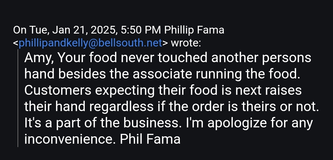 So, I emailed a complaint, and this is the response from what I assume is the owner here in Beckley. So just know if you're going to Bellacinos, it's hard to tell how many people may have gotten your food before you. Because they were obviously standing right over the other customer the entire time and know without a doubt that he didn't touch, breath or otherwise contaminate the food they now...