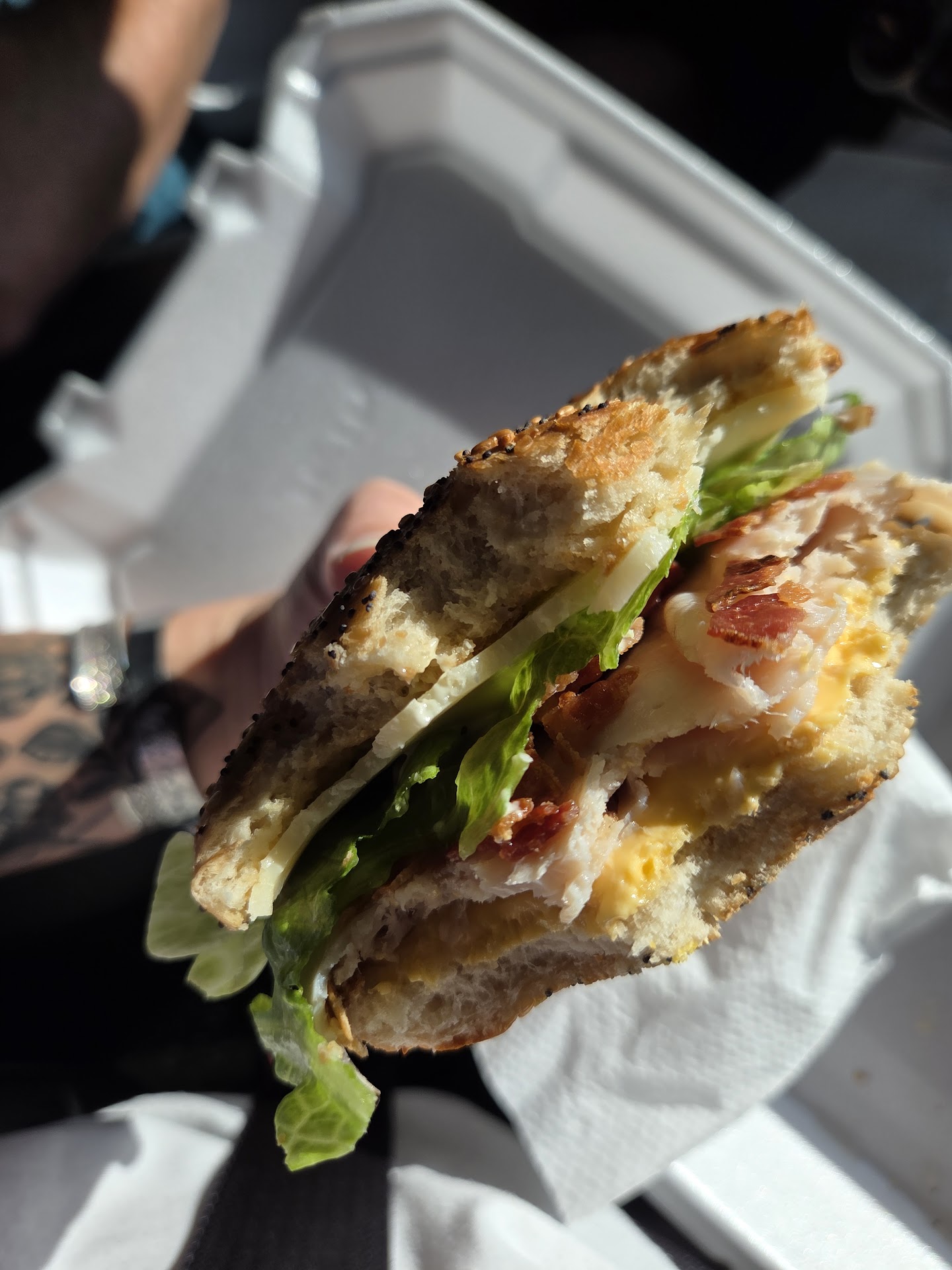 We ordered two coffees: a hot caramel latte and a dark chocolate mocha with a hint of orange — both were absolutely delicious. For food, he went with a breakfast bagel loaded with avocado, bacon, and egg, and he devoured it. I wasn’t in the mood for breakfast, so I got a lunch bagel with turkey, bacon, cheese, and lettuce — super fresh, crispy, and totally satisfying.