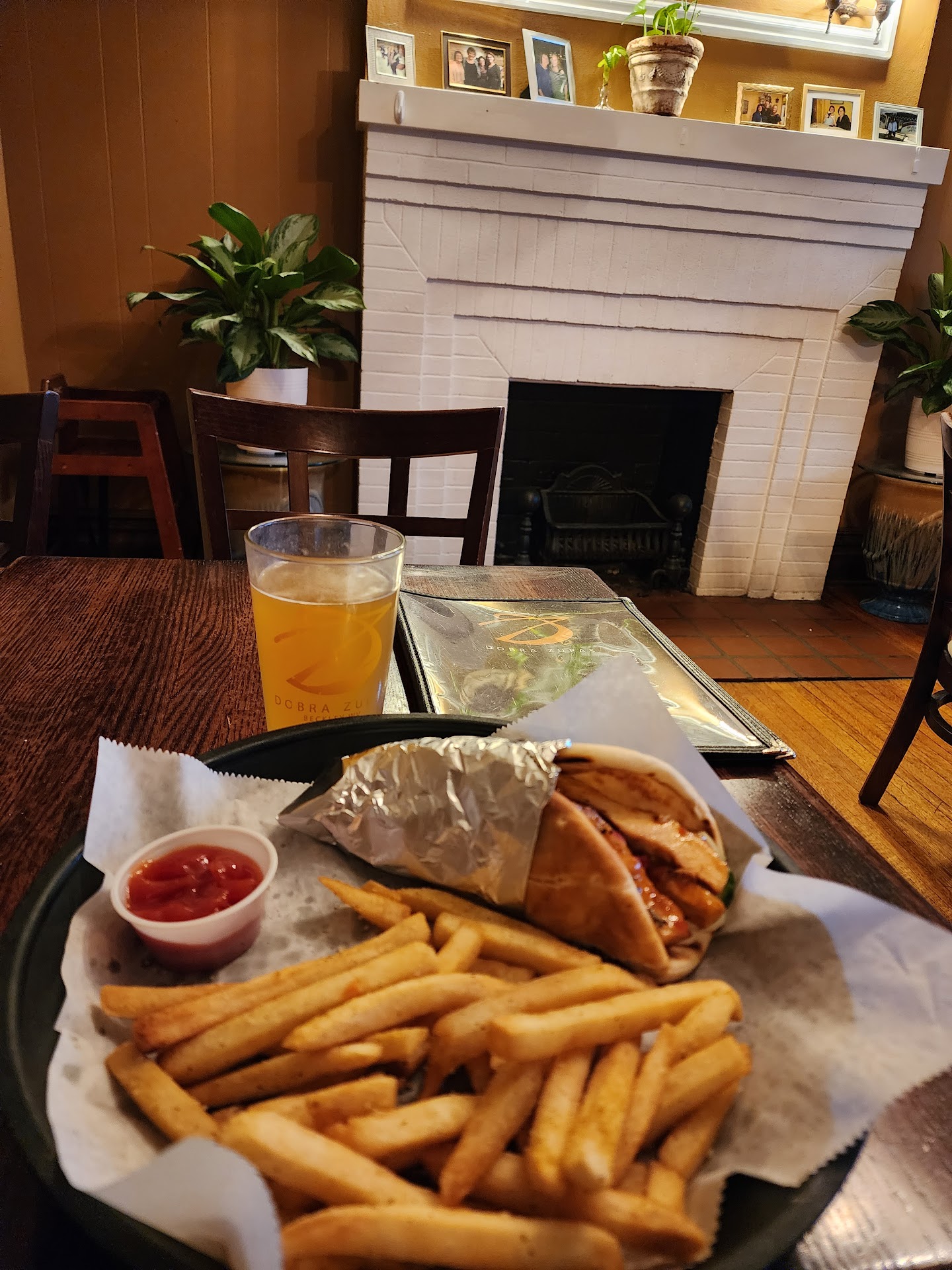 She did bring my microbrew craft beer out quickly which was a perfect blend with no big hops aftertaste. I ordered the Thai Chicken Wrap which had nice chunks of chicken, cucumbers, peanut sauce in a pita (delicious) and a good helping of thick french fries (which could have been a little hotter).