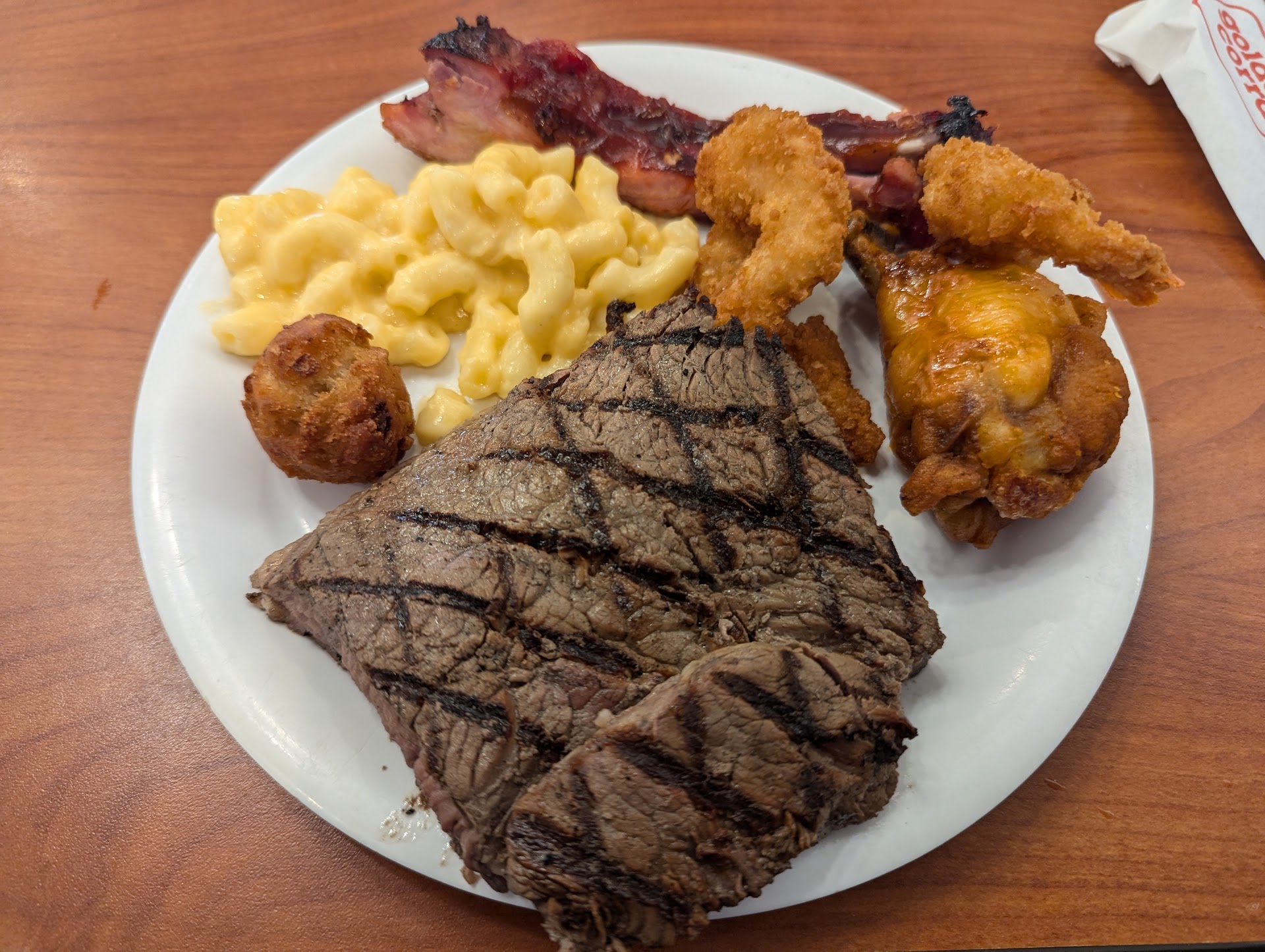 Now with that said, the food was great. Food pans were restocked consistently. The steak and other meats were done just right. There's plenty to choose, from seafood, poultry, pork and beef, pizza, pasta, multiple potato dishes, all kinds of vegetables, melt in your mouth dinner rolls, fresh salad fixings and fresh fruits and a fully stocked dessert bar. If you leave hungry, it's your own fault! I'm getting hungry and wanting to go back just thinking about all that food.