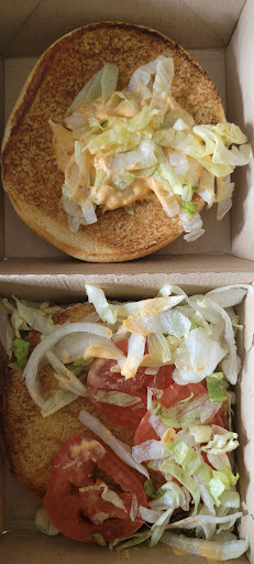 Atmosphere The eating area inside was OK, tables clean, floor swept. The menu board had 3/4 panels black, 1 broken. When asked what happened, they said "We're not sure what's going on, we've already replaced them once and now one's broken. " Outside seating not maintained, green mold/moss/lichen/?? On white seating, giving a neglected feel. Men's restroom was dirty, with non-functional locks. Ladies restroom also dirty, small stall had non-existent lock and damaged paper dispenser.
