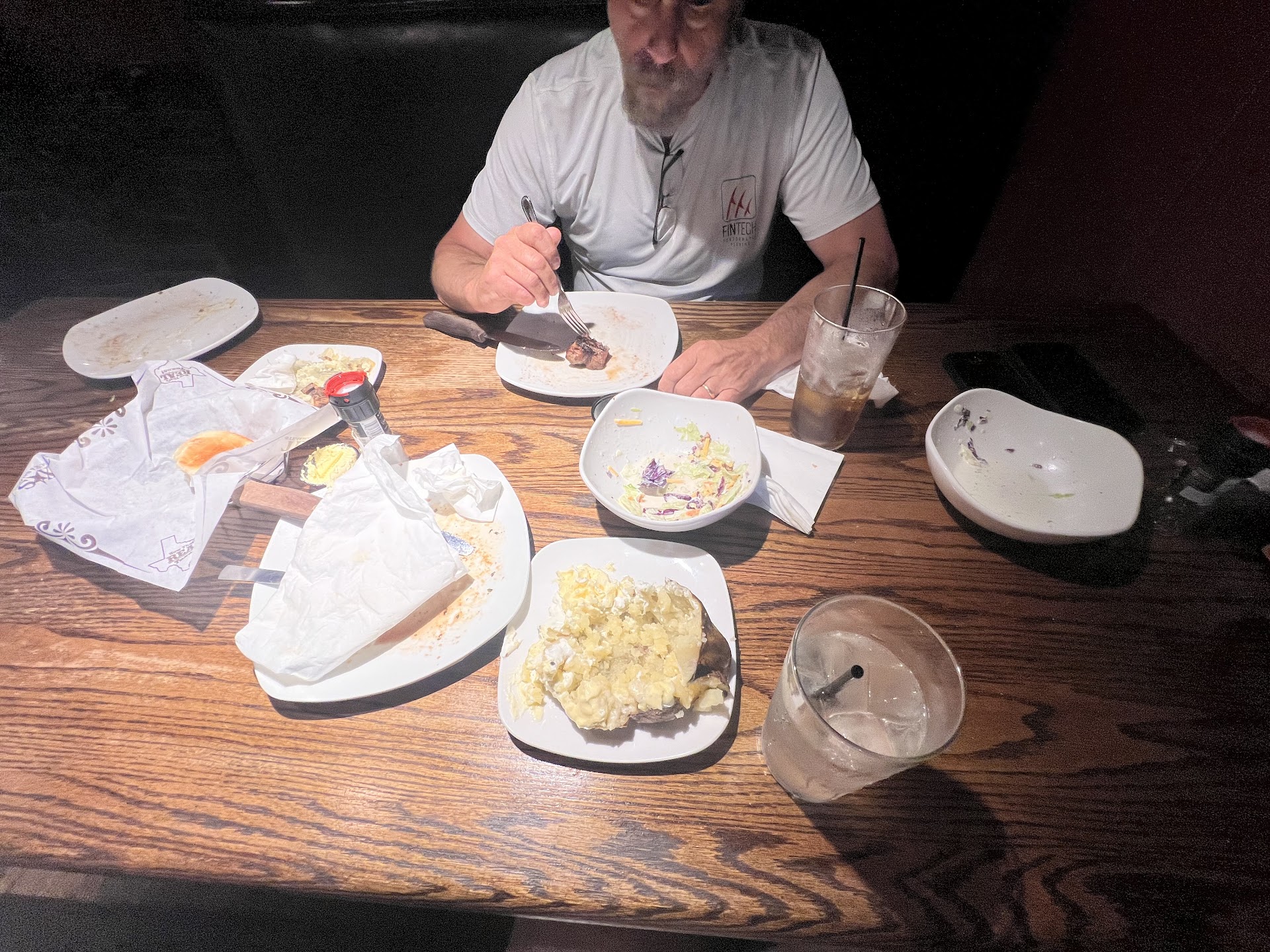 Read moreHad dinner here during a 1 night stop over while traveling. Was close to the hotel.... convenient. It's called a Texas Steakhouse Saloon, so I'll be generous and attribute the sticky tables, dirty floor, and the general worn out look of the place to the rustic ambiance of a Texas Saloon. Requested table & chair seating opposed to a booth. After assisting the hostess cowgirl with putting the table back together, got seated. Wife and I ordered a couple of beers to start... I guessing they were served Texas Style....warm mugs with flat beer. We each ordered a Texas 2 Step. Price in the mid $20 range. Mine was steak, grilled shrimp, rice pilaf. Her's, steak, ribs, mushrooms. Came with a salad. Both the Cesar and House salads were excellent. My dinner, barely edible. Steak unseasoned, dry ,and flavorless. Rice was dry, crunchy, barely warm, soaked in oil. Shrimp was super over cooked, dry, and flavorless. Wife's plate much better. Steak ok. Mushrooms good. Ribs dry and poorly sauced. Small portions on huge plates. Most of the food looked to have been prepared days before, then refrigerated. In essence, reheated leftovers. Choked it down, paid the check which had to be redone due to items on it we didn't order or receive. Rode off into the sunset, never to return. Gave 3 stars. On expanded scale 2 1/2. UPDATE... The Owner responded asking me to contact to address the issues. I didn't and won't....why??? My reviews convey my experience at a business. I attempt to be fair and objective. The reported experience isn't going to change. It's history. The intended target of my reviews are the general public and potential customers of a particular business, not the business owner. The Owner made decisions on how to run the business. I only provide the results of those decisions from a customer viewpoint. Of course the Owner can read the review; maybe gain some insight for the future, but can't undo...