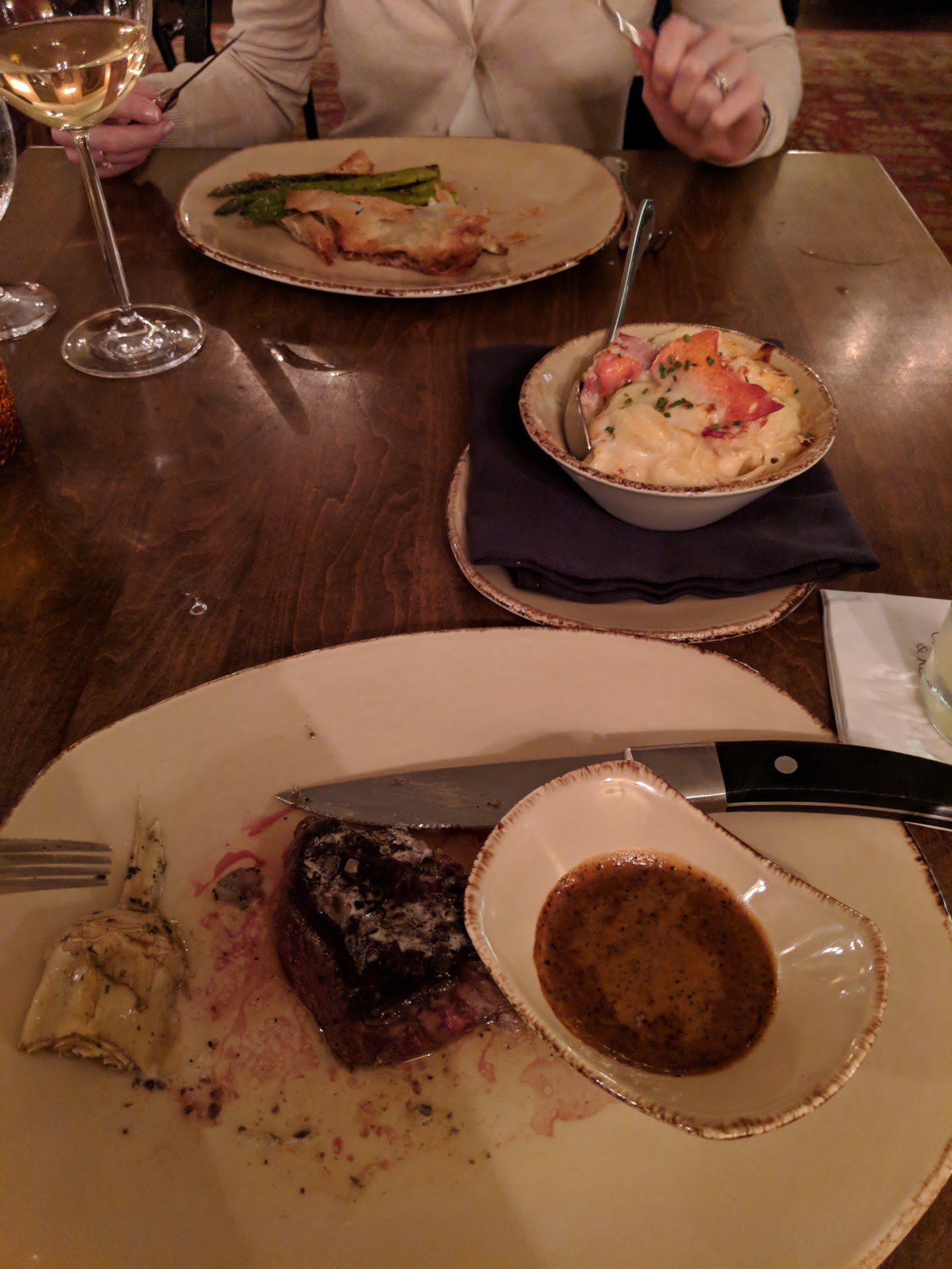 As sides we got the truffle fries and the lobster mac - the truffle fries came out without truffle, but our server quickly corrected this and maybe they overcompensated, but it was COVERED in truffle sauce. Since truffle fries may be my wife and I's favorite thing in the world, we were in absolute heaven. The mac and cheese itself was out of this world, but the lobster I could have taken or left. I wish they just had a side dish of mac and cheese, because I'd probably order three and have that as my entree.