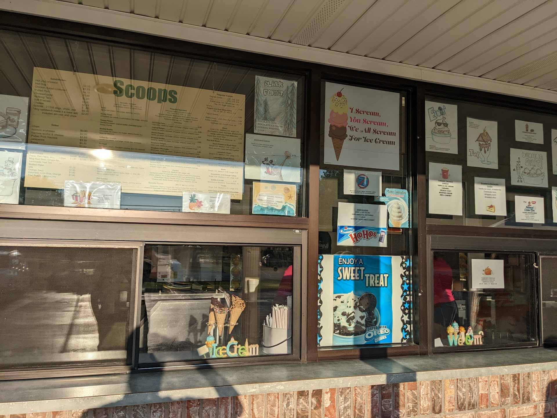 We visited today around 7:30pm and it was busy! They have a walk up window and a drive through. We opted for the drive through this visit because we were with out-of-town company. We were in line for maybe 25 minutes. The window line was also very long. That wasn't their fault. They serve delicious options! The folks taking our order and whipping up our ice cream were friendly and quick. The cost for 3 medium ice creams and a special was about $25.00. I got the Brownie Sunday. It is my favorite. The portions are quite large so prepare yourself if you are getting ice cream for littles. They also have food options and drinks. There is a parking lot surrounding the shop and tables near the window to sit and enjoy...