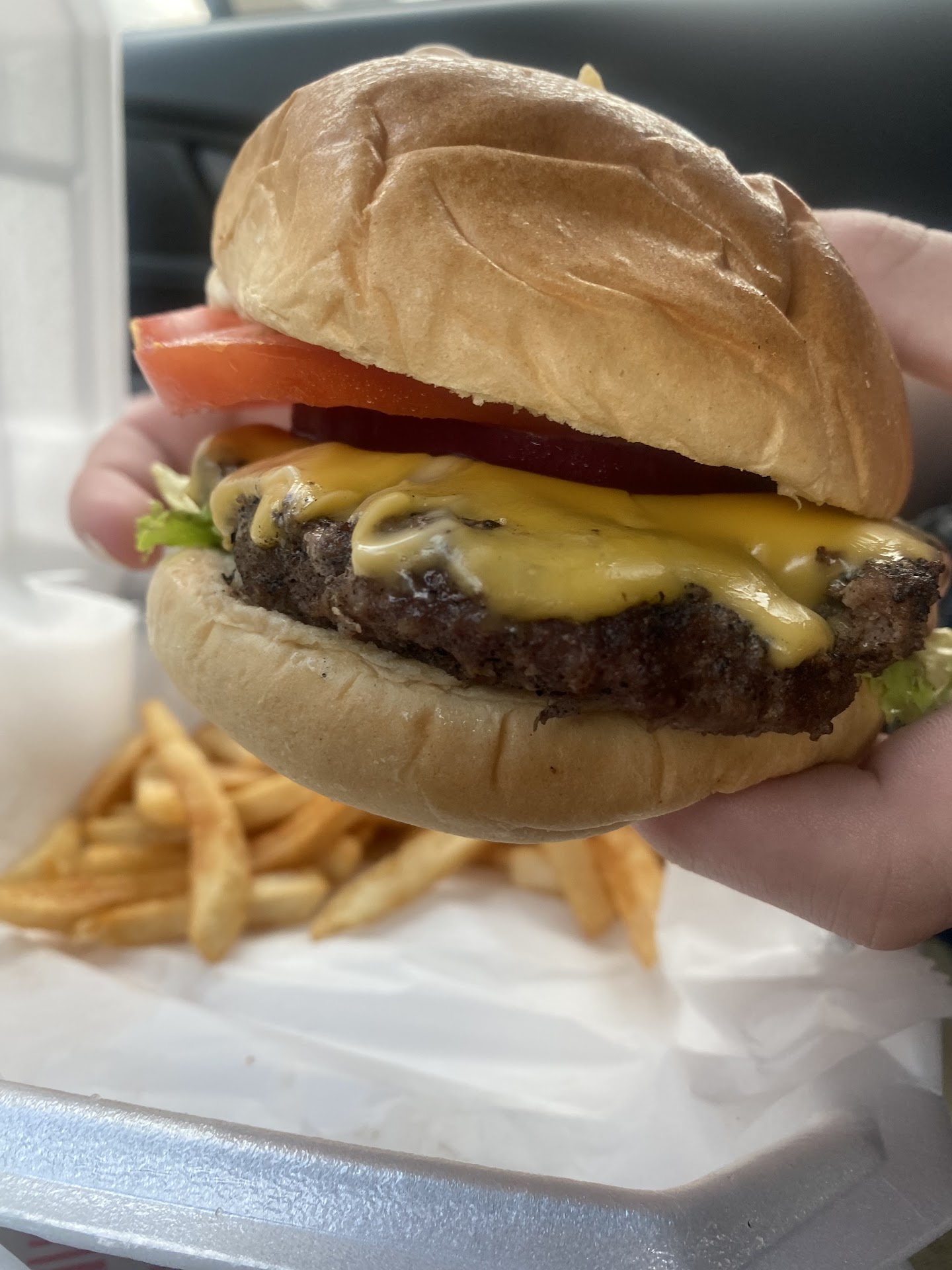 I smelled it, took one look and had to have a bite. It legitimately made me cheat on my diet! The fries remind us of my late southern fatherโs hand cut, kettle cooked fries. Oh, they were so good. But that burger! The burger was huge. Tasted like it was done on a grill. I only tried a little piece of the meat itself, but that was enough to get the smokiness and seasoning. My son loved it and heโs our burger connoisseur.