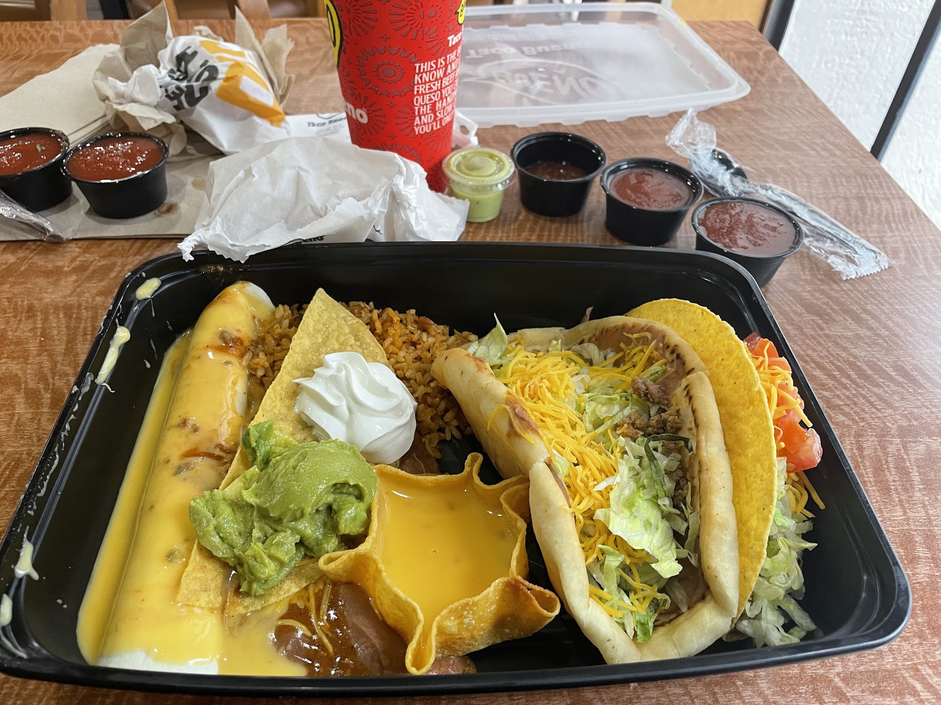 Read moreThis place is much better than a few years ago. I took off my old post of 1 star from back then. I've eaten there 3 times dinning inside this month and not bad. Better management and clean. I got the beef chilada (1) / taco (1 soft or crispy) platter. Has rice and beans, guacamole, sour cream and chips. Small soft drink and total was $11.24. All tasted good, the refried beans didn't taste the same as Taco Bueno used to make them but still nice. I don't trust the open condiment bar for you never know if someone contaminated it. The platter is only $7.99 before tax and the small drink was $2.39. A good portion of food and better taste than Taco Bell. I like Taco Casa but sometimes I get sick from the meat when it's dripping...