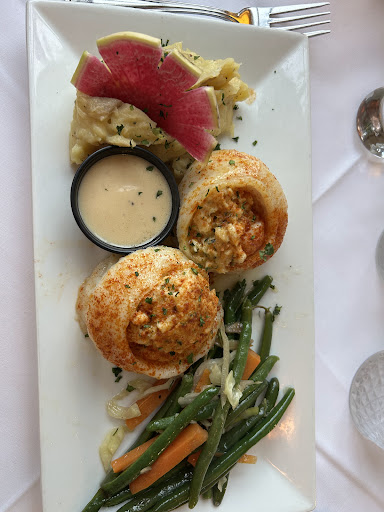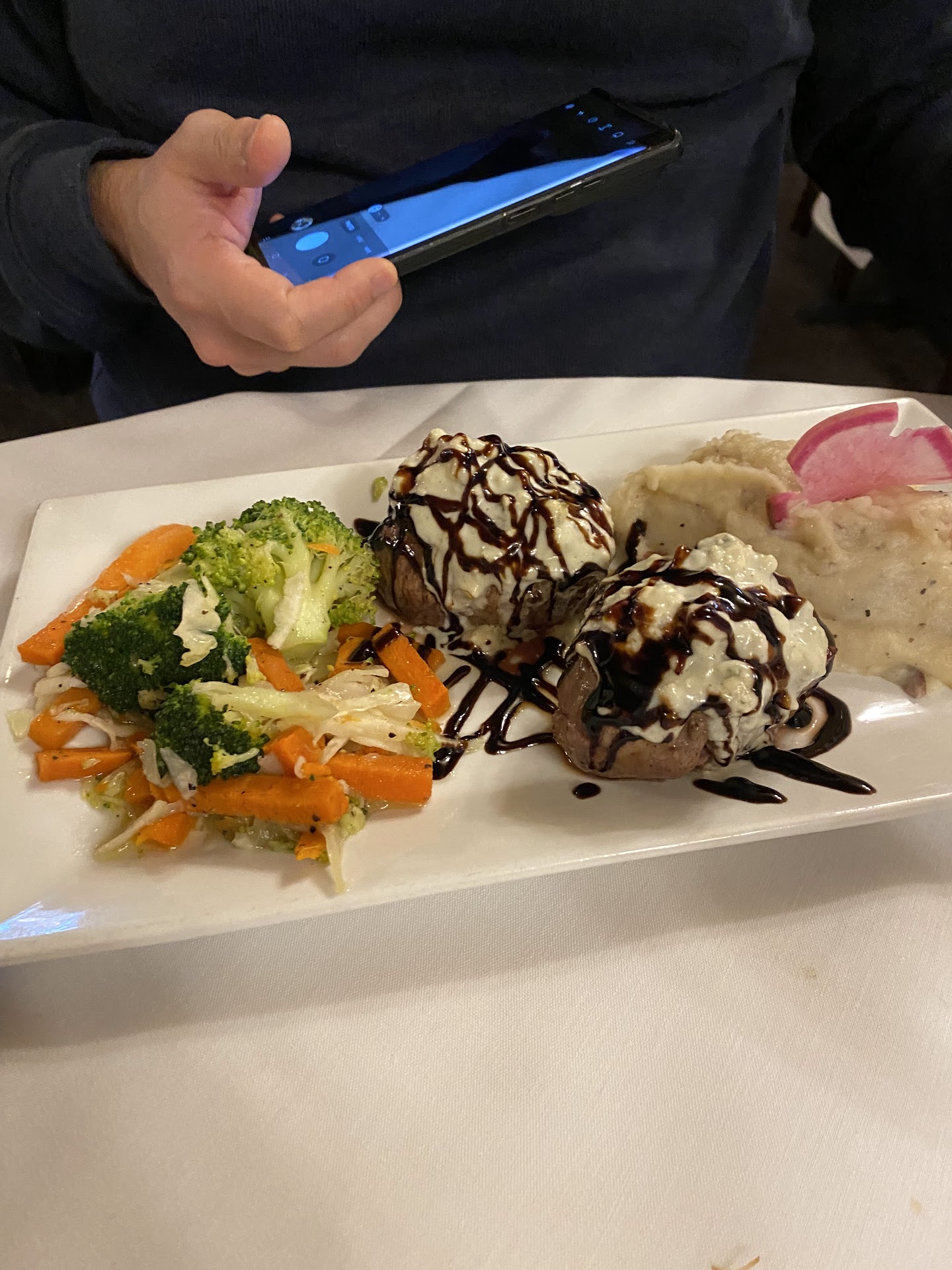 Great service, with fourteen people dining, celebrating a Mom / Grand Mom's 80th. Entrees are served with salad, a square crispy roll and mixed veggies. The plating presentations reminded us of Mondrian compositions. Prices were reasonable; the filets ordered medium rare arrived at their requested temperature. At a distance, from the side, the filets resembled huge double burgers. After cooking the steaks measured about an inch and a half high by 5” diameter. Everyone enjoyed their seafood meals from Crab Cakes, Flounder Stuffed with Crabmeat thru Shrimp and Pasta. The bright white square and rectangle platters were accompanied when requested by large wine glasses nicely filled, followed by a small carafe. We brought a specially prepared cake which was sliced carefully. The extras were generously divided into very nice boxes for family members to take home. Tax tags and title the bill was just over 60 per person including tip. .