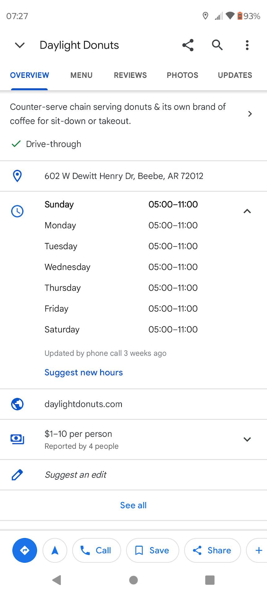 The biscuit and gravy meal is excellent and filling. Prices are very reasonable. Staff is always fast and friendly which makes you feel like they truly appreciate your business. Only day light donut place left that I know is like the one that use to be n Cabot. Just wish they had more flavors in the filled donuts but not a deal breaker with me. Food is delicious. Favorite...