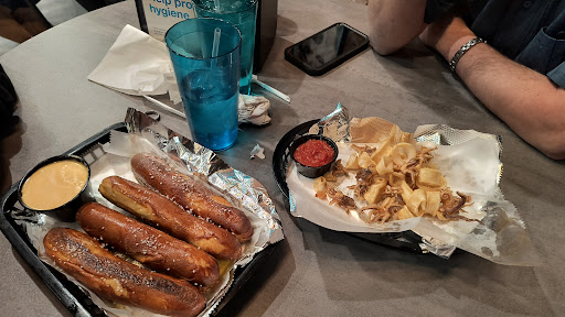 We had the pretzel sticks with beer cheese, fried (not breaded) calamari, Chicago style hot dog with loaded baked potato, hot beef over red mashed potatoes, Lightly breaded lake perch with coleslaw and chicken noodle soup (not pictured), cappuccino crunch and playdoh/superman ice cream with whipped cream and M&Ms.