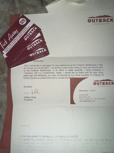 Read moreEDIT! About 30 minutes after writing this review, I received a phone call from William Hicks, the Outback manager and spoke to him for at least 15 minutes and he was so kind and apologetic. Today I received a letter from him and some gift cards! This more than makes up for our experience and we will definitely be going back!!! First, it was Valentine’s Day so we expected busy. Placed a to go order that was to expected to be ready at 8:30. Total chaos when we arrived (there was a pick up line the parking spots were blocked) so I called to make sure I was in the correct line etc. The young girl told me yes I was in the correct line and asked my name than proceeded to tell me @ 8:35 that my order hasn’t been started yet because the kitchen is prioritizing the dine in guests. After being asked our name 3x by employees AND checking in online saying we were there, we still were sitting in our car after 9pm. I was seeing other costumers going up to the door and getting their food (although we were told not to) so I decided to see what was going on & there were 10+ bags sitting (and 3 young girls just chatting) but NO food! Finally I got food at approx 9:10! Should’ve snap pics because it was TERRIBLE!!! The bread was cold, wet & mushy on one side and hard and stale on the other & no butter. Our filet meal was literally Cold not even slightly warm, although cooked well. The fresh veggies were wrapped in plastic wrap cold & completely mushy like baby food texture! The veggie juices had leaked into the box I guess and the fries were also mushy & cold!!! I get it was busy, but the expectation times should’ve been readjusted or something! (Although 10-15 bags of food waiting to be picked up doesn’t seem like everyone’s food was late) I honestly wish I would’ve got fast food! $65 on food that was barely editable. My daughter only ate the filet after we warmed it in a skillet. The entire experience was surprisingly terrible. Two managers came outside at one point… they could’ve just apologized. Next year don’t offer carry out! It was...