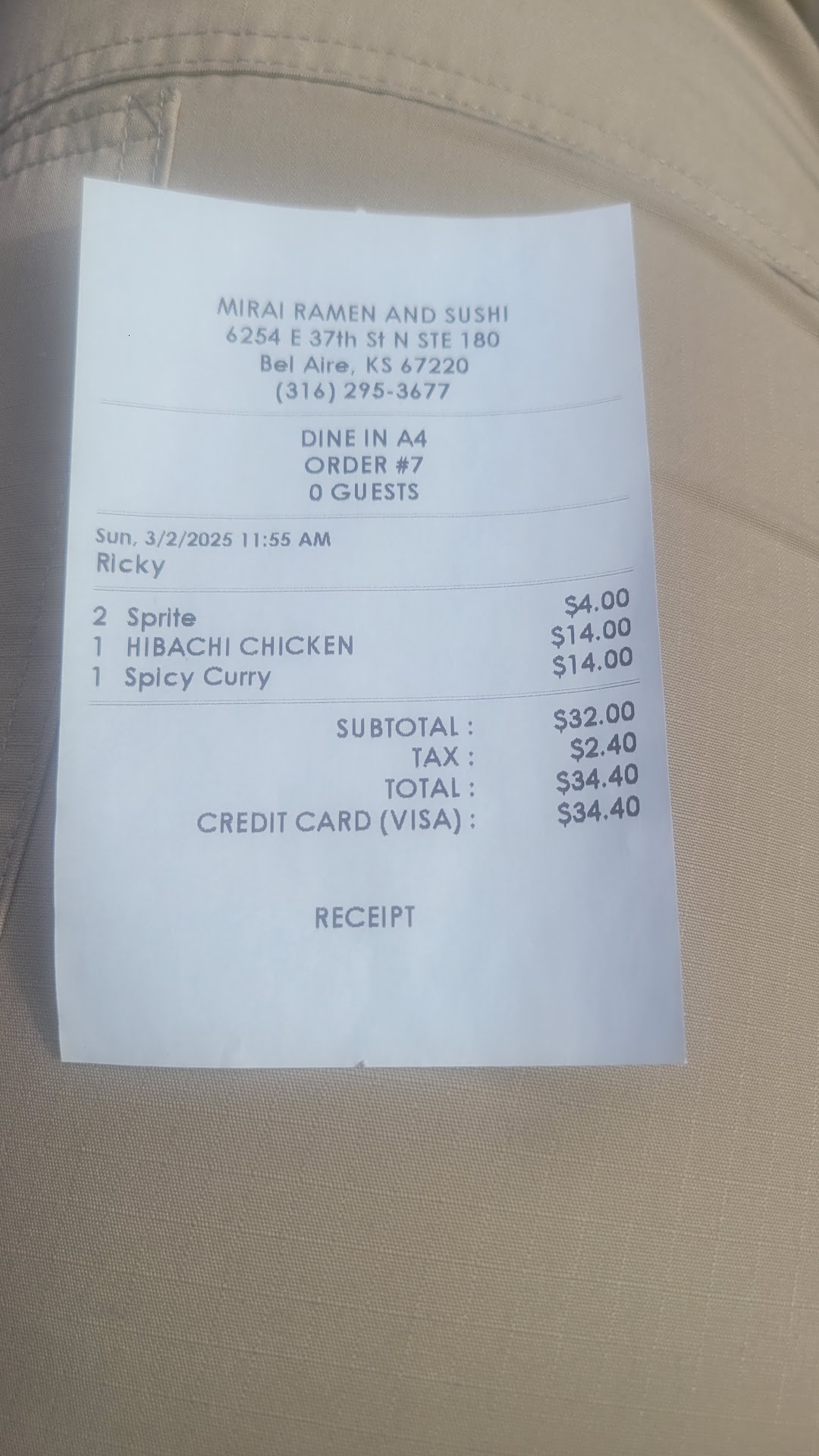Read moreListen spare you stomachs the illness and disappointment. I tried this place a few times and keep trying to give it a chance because the reviews are so good. Im done trying, this place is nasty. Each time that I have tried this place it has been below average. Yall lying in these reviews and this place is over hyped. This time I got two things from here, the spicy curry ramen and the Hibachi chicken. I tried something different from the last time. Both meals were gross. The spicy ramen, was not spicy at all, more like fishy. The broth was more of a thick paste and the noodles were so mushy it was like they got left in the microwave overnight. The taste and the after taste had my taste buds ready to fight me, it was so nasty. I could not even eat it. Then the Hibachi chicken, was fishy and not to mention it was a lot of sauce. The rubbery chicken was swimming in sauce. It was over powering and ruined the meal. The best thing they had was the Sprite and even that was not good and it was from a can. This place is not worth the price or stomachache. I literally threw up before leaving the restaurant. Nasty and gross, naw just down right disgusting 🫣 😒 😤. Wasted my money, Don't...