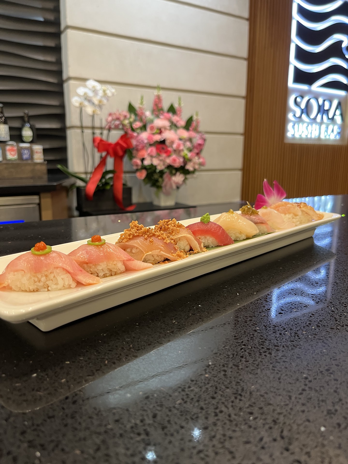SORA FULL SET: Highly Recommend Edamame Ocean Trout Sashimi (ponzu and chives) (4pc) Yellowtail Sushi (serrano chili, yuzu kosho, ponzu) (2pc) Albacore Sushi (ponzu and fried onions) (2pc) Tuna Sushi (ginger scallion puree) (1pc) JPN Sweet Shrimp Sushi (dashi soy) (1pc) Scallop Sushi (yuzu kosho lemon and salt) (1pc) Seabream Sushi (yuzu kosho and yuzu juice) (1pc) Amberjack Sushi roasted shishito peppers (1pc) Black Cod Sushi (den miso) (1pc) Fish Cut Roll (4pc) Lobster Cut Roll (4pc) Cost: $45