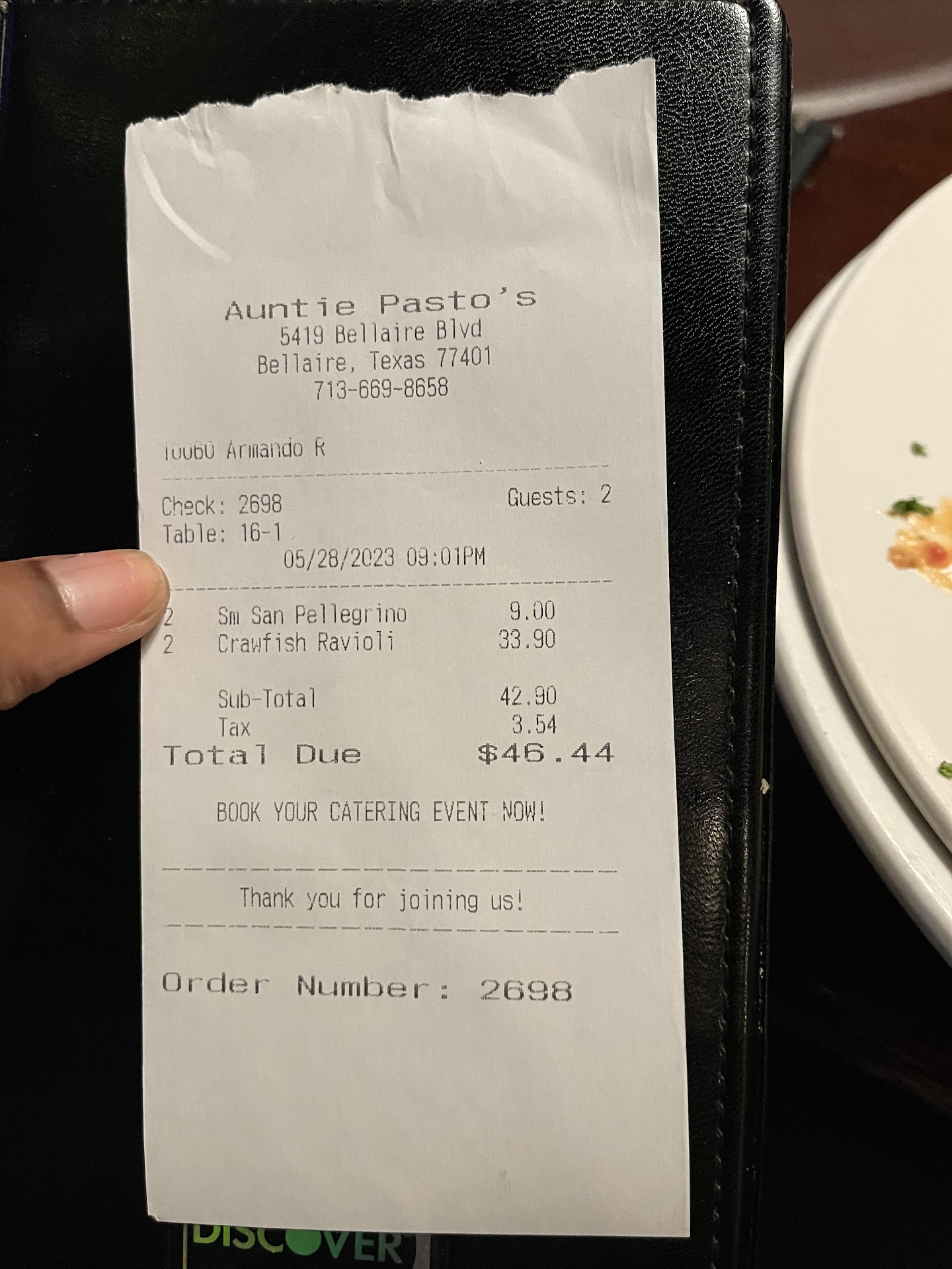 Read moreIt saddens me to give this place 2 stars. I have eaten here my entire life. I used to come here as a kid after Bellaire little league baseball. Right after high school I even worked as a server here. I used to come here all the time for crawfish ravioli and the house tea is delicious. At that time this place was amazing with impeccable service and quality food. My new issue may be the result of the pandemic though. I know a lot of small restaurants/businesses took a bit during the pandemic. However, ever since the pandemic the quality has gone down significantly on numerous dining visits. My wife and I ordered two pizzas to go. We got home and the pizzas were still doughy/undercooked and there was barely any tomato sauce on the pizzas. The next visit my wife and I dined in. I ordered crawfish ravioli with extra sauce and my wife got plain lasagna. The waitress instead put extra sauce on my wife's lasagna instead of the ravioli. My wife's lasagna was swimming in sauce. Not a big deal. It was corrected and all was good. Then on our next visit we ordered the same thing -ravioli and lasagna. The waiter was great. He brought us out an interesting looking salad with artichokes and olives with homemade italian dressing. He said that it was an "extra salad" that they made and didn't want to throw it away. However no one else around us was eating salad. So I hope it wasn't just old. My wife and I went home and her and I were sick to our stomachs for the whole night. I will not say it was for sure due to something we ate at Auntie Pastas. I do not want to slander my fav restaurant I have been going to since I was a child. However, I just wanted to share my recent negative experiences. My wife and I literally live 2 blocks away and unfortunately due to these recent experiences we have chosen to not return for a while. I truly hope it...