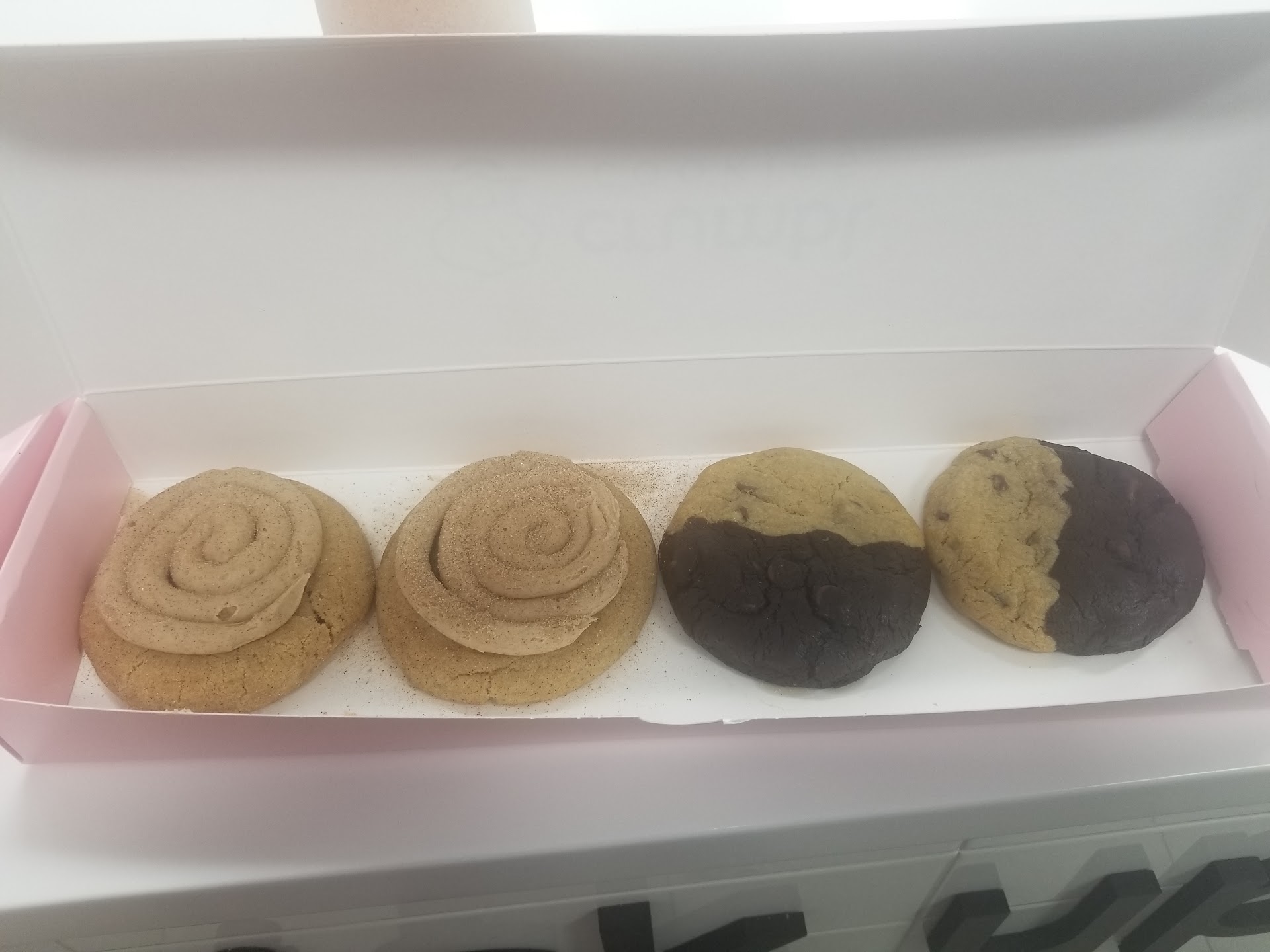 Fortunately, a gentleman from the kitchen took it upon himself to ask my name and put my four cookies in a box so I could go home. Glad it was him too.. cause he was actually wearing gloves unlike the cashier on her phone and fixing her hair between throwing cookies in boxes and slapping the label in the wrong place for food delivery people.