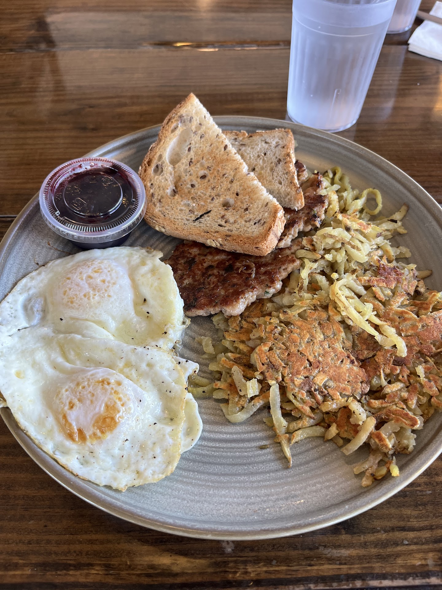 I ordered the Bellaire breakfast. This comes with 2 egg (I ordered scrambled), 1 meat (ordered maple sausage), 1 bread ( ordered a biscuit, and there is a upcharge for a biscuit), also comes with hashbrowns. When asked if I wanted I drink I ordered coffee. I was surprised when she asked how many cups as I'm used to normally just getting refills of coffee at most places. So I said "2cups", total came out to about 20 bucks for breakfast. I'm not looking for deals on breakfast if I were I'd go to McDonald's, my issue here is there are expectations if a basic breakfast is going to be charged at this rate.
