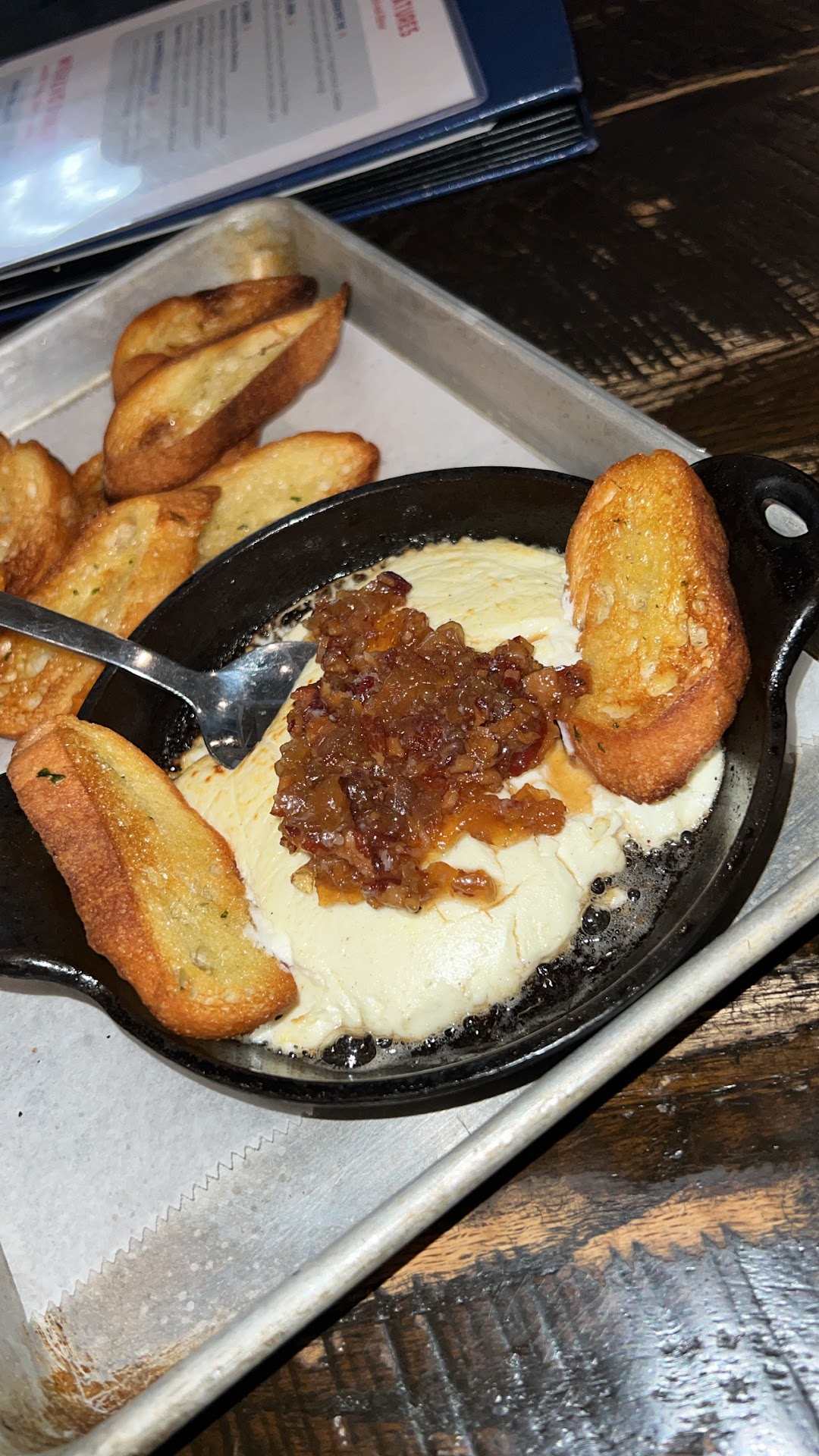 🔶 BAKED GOAT CHEESE. Topped with your choice of homemade bacon jam or crumbled candied walnuts and dried apricots and served with a toasted baguette. $14