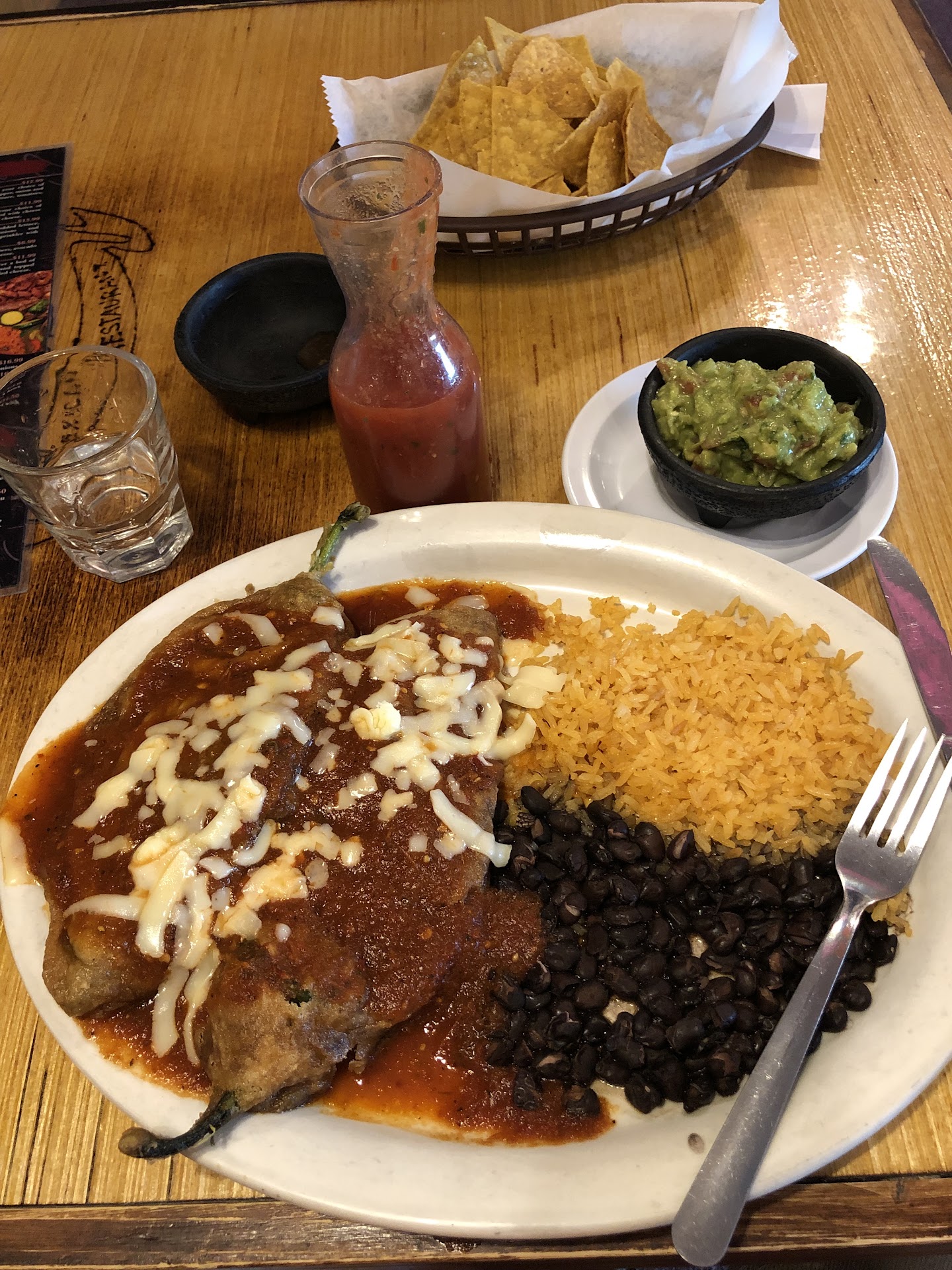 Amazing food, great pricing and wonderful atmosphere. First, let me start off by saying how these employees went above and beyond for our first visit here. We have a service dog who was with us and requested to be put kind of away from people and they quickly and politely obliged our request. Second, The service was fast and top notch. I ordered a pina colada and it was delicious - perfectly made. I ordered the carne asada street tacos and they made them exactly how I like - steak, onions and cilantro only. Perfection! The steak had a little bit of sauce on it and was tasty! I loved everything about my meal. My husband has an enchilada platter and he loved his food too - he said we are definitely stopping here again on our way back.