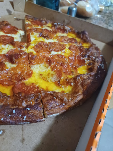 Review from 7/31/23 @ 6:45pm. Ordered an Extra Most Bestest online. Order showed ready 3 min after ordering when I requested pickup 20 min ahead. When I got there 2 of the 3 employees I saw were sitting down in the back on their phone. No napkins or spice packs stocked on counter, drink cooler not stocked and disorganized. Also I asked for some spice packs and peppers as I saw them on the shelf behind the counter and "Carlos" said sorry no and shook his head. Also, the extra most bestest I ordered had like 8 pepperoni on the whole thing, was stale and like warm, basically took a leftover hot and ready and shoved it in the warmer so they didn't have to make another pizza. -5...