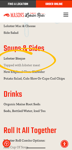 Then I thought, "Oh ... I'm sure it was an honest mistake and I'll let them know that they forgot to add the lobster." I get it ... lobster can get chewy if overcooked, so it makes sense that they add it at the end. But I returned to their website to ensure I didn't miss something. Nope - sure enough, it says, "Lobster Bisque - Topped with lobster meat" (see attached screenshots). I then went back to the Online Order and after a bit of digging, I realized that there was a modifier buried further down the order screen (invisible unless you purposely scroll past the "Add A Bun" option). It seems that you only get any semblance of seafood if you select "Add Lobster Chunks" for an additional $6. It never crossed my mind that I'd need to specifically request lobster in my lobster bisque. All the pictures show a COPIOUS amount of claw meat and I understand marketing; I know that pictures often oversell what you really get. But I genuinely expected my bisque to be "topped with lobster meat" or at least contain some sort of lobster-ishness. I tried to find even the tiniest shred of seafood but it was simply bland, blah broth with a creamy-ish element. I was able to pull up two tiny blobs of flour, but that's it.