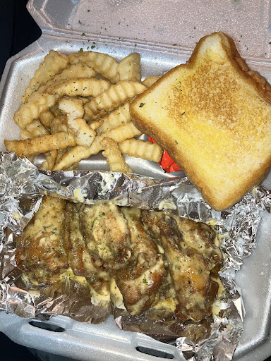 Read moreFood 😆. Overpriced mediocre party wings frozen prepackaged burger patties Canned cheese sauce 😕 Service 🥱 counter space only. Small takeout. Looks like Moma Elayne was working Cash and taking orders. Looked just like the logo lady. Atmosphere 😵💫 Price list on counter unreliable. Waiting in car for order. Now back to the food which is the only reason for coming. Black owned never tried. I'm ready 😁. Nope 🥴 $$$50$$ 👎 horrible food. Order kids cheese burger 🍔 mealw/cheese on the fries Which was 8.99$ + cheese 2$no drink included. Burger 🍔 frozen small patties. 10 piece Bourbon chicken w/fries 16.99$ no sauce under cooked party wings.😐 10 piece Garlic Parmesan w/cheese fries 16.99 $+ 2$ under cooked chicken and canned cheese sauce 😕. We left in a tip not knowing the food was 👎🗑️💯 . We gotta get better service from our establishments. Don't expect to get off trash food simply cause it is being served by skin folks. I think 🤔 it's easy to make a burger 🍔 patties. It's even more easier to add sauce and cook through. Fries 🍟 are always simple but not with mystery canned cheese sauce 🧐🤨