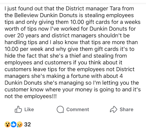Read moreStopped by and the line was wrapped around the building, but what else is new? Finally got to the window, received kind & speedy service by the sweet young lady in the window, I handed her a small tip, but was met with much surprise when she kindly rejected. The young lady said they are no longer allowed to accept tips, although Iâve tipped at this location weeks prior. When I asked her why, she said she wasnât âallowed to talk about itâ and looked nervous at the mention. Which reminded me of something I saw in a Facebook group not too long ago. This event helped me piece the two together, and all I have to say isâŚâŚ really Dunkin? Workers are already working for their stateâs bare minimum and you take even the privilege of a couple bucks tips away from them? Forcing them to stay quiet because others are seeing your shady practices! I wish I couldâve told her not to allow them to silence her, but who am I? I was a loyal customer to this establishment, but now Iâm formally disgusted and disappointed in these allegations. An employer who will steal and punish employeeâs from such little privileges such as tips shouldnât have any employees at all! What a disgusting business practice. Anyway, rant over. I guess Iâll visit...