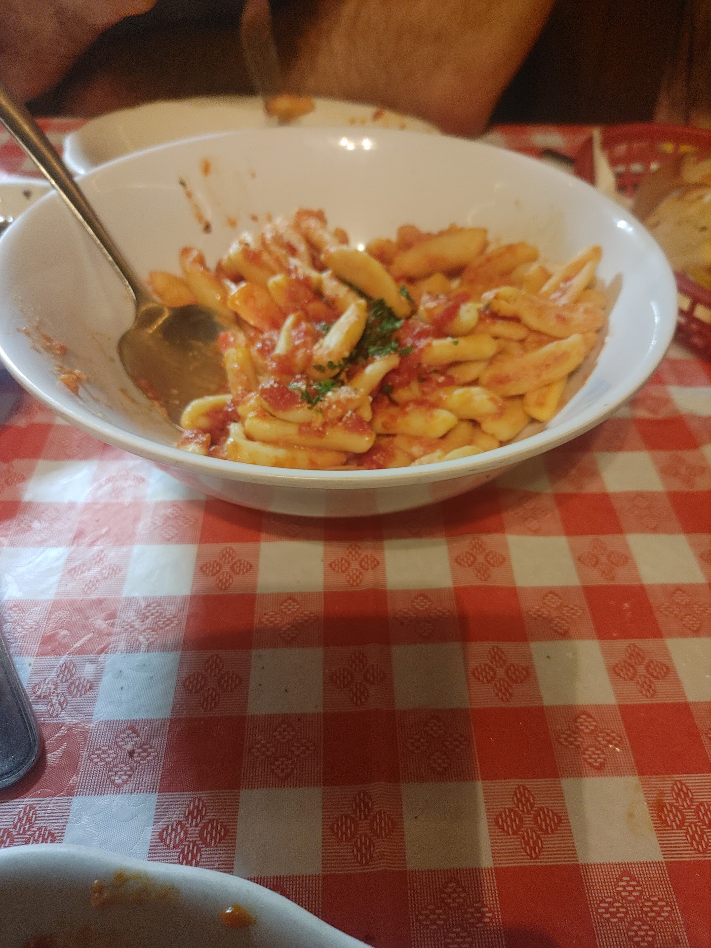 Not horrible, but not good. The place is considered a New Jersey icon, so i wanted to give it a try. It is yet another "classic" place resting on its laurels, and not really trying to do a good job anymore. 1. the chicken savoy is a famous dish there. I did not care for it, but some may like it. To me, it was a very dry cut up chicken, soaked in vinegar, and some other seasonings. The vinegar was overpowering and too sharp. Hey, to each his own. Shrimp beeps, a.k.a. shrimp fra diavolo. very good, small portion for the price. Prob the best thing to order there. cavatelli in pot cheese. pretty darn good cavatelli, but as others have pointed out, where is the pot cheese? kind of a hint of cheese flavor on it. grilled peppers. wow, kinda spicy, but that is what peppers are. clams oreganata. very small clams, not many of them on the plate, and because they are small, not much clam meat. they were towered with seasoned bread crumbs, so much so that they outweighed the clam meat itself, instead of just topping it. The flavoring was excellent though. service. this is interesting. when we got there, the service was great, but during dinner, the place got very crowded, and very loud. because the seats are all packed together too tightly, and the place was so noisy, the service could not keep up. Ambience. A lot of famous people photos on the walls, but really, it looks like a dump inside. I like dumps, but perhaps they overdid it. the tables are VERY close together, if not touching. so you really don't get your own table for your party. We had two old men next to us commenting on our conversation (and asking us if we would pay for their dinner.) Finally, the place is LOUD. It could be due to the bricks on the walls echoing the sound, the lack of carpeting, how much they pack in the people, but it becomes so loud you have to shout to be heard by the person across the table from you (kind of a vicious circle, isn't it) Would I go back? Maybe. Would I go back soon? not really. Definitely there is much better Italian food in New Jersey. Many, many more traditional, old school, family owned Italian restaurants in New Jersey. Ones with good quality food, good portions and good prices. Out of all of them, the food at Belmont is easily the worst. Perhaps that is why the best they can do is compare themselves to Olive Garden. Homemade???? Pretty sure it is restaurant made. Please stop...