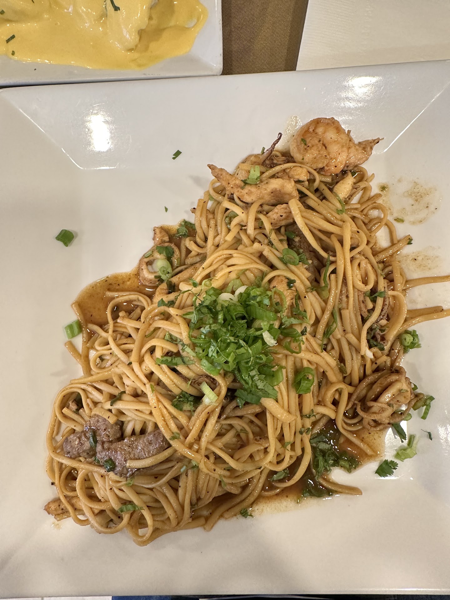 Dine in at 19h Sat. They saw us, pointed to a table and took at least 10’ to give us the menu. Blonde girl, nice but slow and could be a better waitress after training. Brunette girl, I guess she’s Peruvian bc of her attitude, treats you as she’s doing you a favor. Our order: Tallarín saltado especial 4 shrimp, some chicken and beef, lots of little tentacles. Noodles I prefer al dente and this ones were a little overcooked. Greasy and sour. I guess they use a lot of vinegar and didn’t have the right heat. Cilantro and green onion as decoration. Personally I don’t like green onion and also in Peru we don’t use it for this dish. Tallarines verdes con bistec, beef overcooked and hard to even cut it (those knifes are not for that). Noodles overcooked and the sauce wasn’t bad, but we expected more. Papa a la huancaina 🙌🏻 We ask for a bottle of Inca cola and they brought it. No glasses n I had to asked for straws. Music a little too loud for the size of the room.