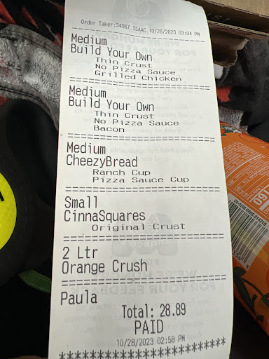 I give it 2 stars because majority of the time I order it is delivered made wrong or half of what I ordered is not delivered. The making of the food is squarely on the people inside and the delivery is on the driver to make sure the order is all there before they leave. Its been rare that my order is delivered correct and all together without having to make another trip or get "credited" and never actually get the credit. I've worked in food service, so has my husband (who has worked for other pizza companies for 13+ yrs) and I am at a loss of why there is so many issues.