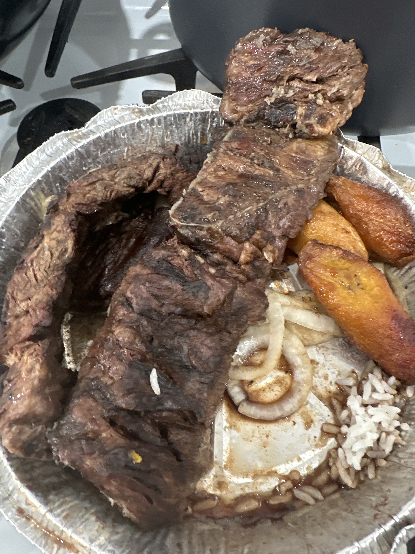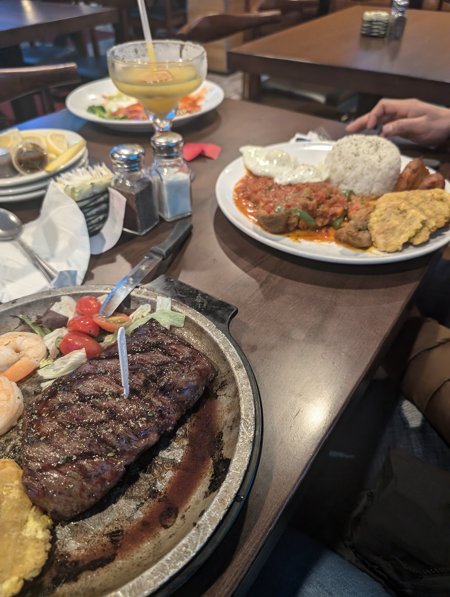 Food was subpar. The sweet plantains were hard and over cooked. The meat was ok. Smallest piece of skirt steak I've ever seen on my plate. Lmfaooo I'm Colombian, and small hole in the wall restaurants give you bigger cuts of steak than this. Just see the pics. Drinks ok. Nothing spectacular. Service was meh, he didn't offer us to see options on the cocktail menu, we had to pry the answers out of his mouth like pulling teeth. I was upset because we ordered a specific drink (Pitbull) with many options and this man just gives us a double beer when we could have had a pitbull with a beer and a shot or a a myx wine. How am i supposed to know what they offer?