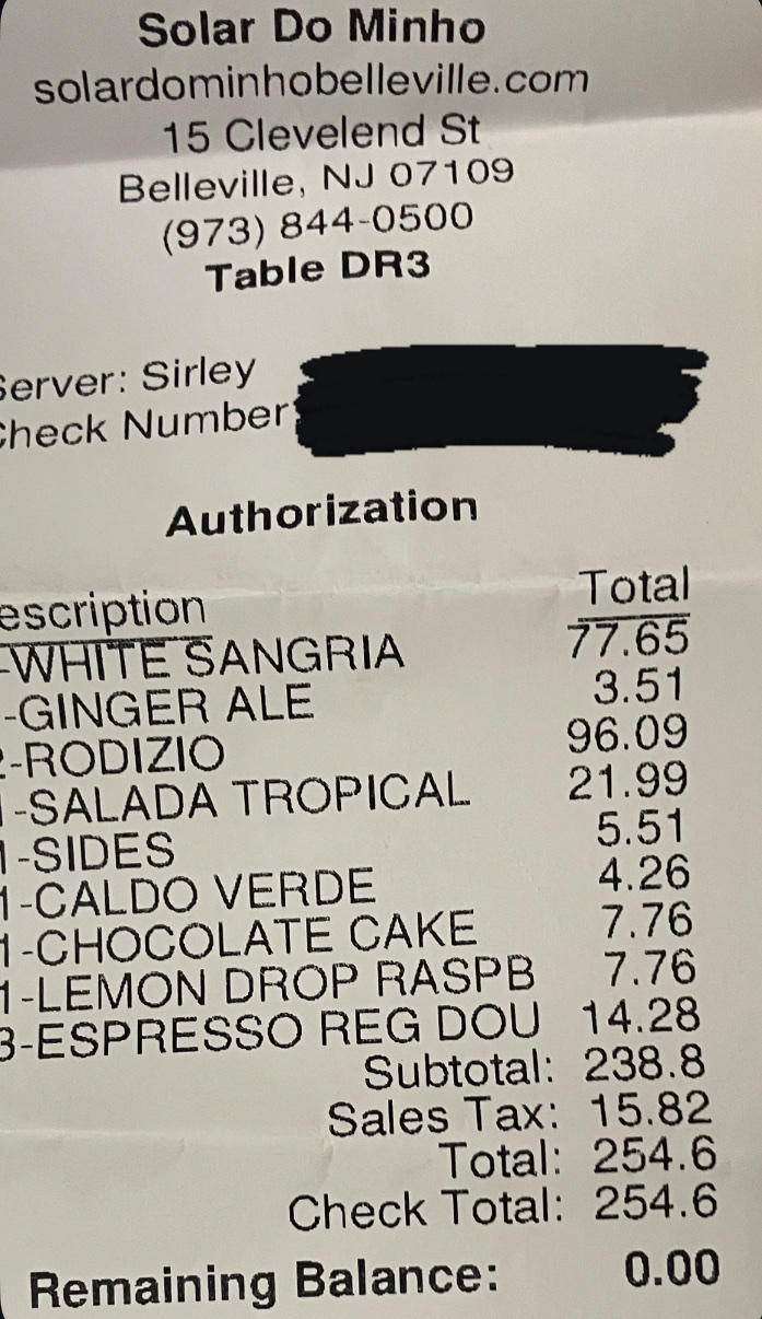 Read moreRate this a 4.5. Wanted to spend some time with my brother and his family mid-afternoon near his house New Year's day before all the festivities. The restaurant was set up for the celebration later at night with a huge tent outside the restaurant, set up with tables etc. The atmosphere in the main restaurant was cozy, family oriented. The staff was friendly, attentive, dressed professionally. The service was on point the servers they all cater to any table that needed service which was a plus. The main waiter, Victor, was funny. We ordered the clams in garlic and olive oil. The serving was medium size. The broth of the clams is the difference in the app. You need the hot bread that is served to complete , and enjoy these clams. You want more, delicious. To drink we ordered the white sangria. It was made the right way with a touch of orange juice that didn't over power the fulness of the sangria, and it was not loaded with fruits so you get to enjoy the refreshing taste of it. For the main course we ordered a seafood paella with extra clams as we requested. Of course we paid a little extra for them. Parts of the paella was dry. From my experience you want the paella to be somewhat mushy. The other dish was a salmon stuffed with seafood, which was delicate, tasty, well prepared. The texture of the fish held together the stuffing, didn't fall apart, delicious. Accompanied with potatoe chips, and rice. Looking at other tables the Rodizio (unlimited servings of different meats) was the main choice. To cap the afternoon we ordered dessert. I had the chocolate mousse, which was a bit parched, not silky not smooth. The catalana cream dish was soft, tender. We enjoyed ourselves. The service was excellent. I may...